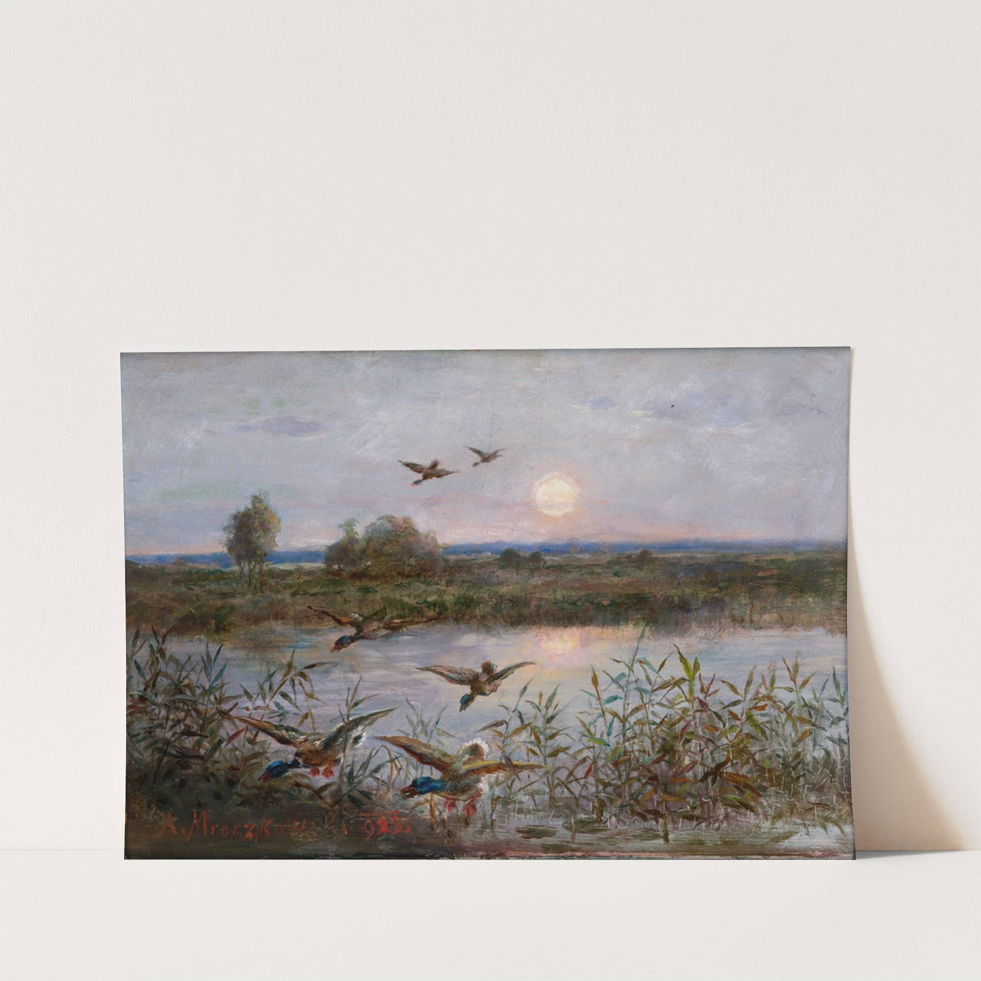 This beautiful art print captures the serene beauty of a marshland landscape at sunset, as depicted in "Ducks over Marshes" by Aleksander Mroczkowski, created in 1923. The scene is rich with natural detail, showcasing tall grasses and reeds in the...