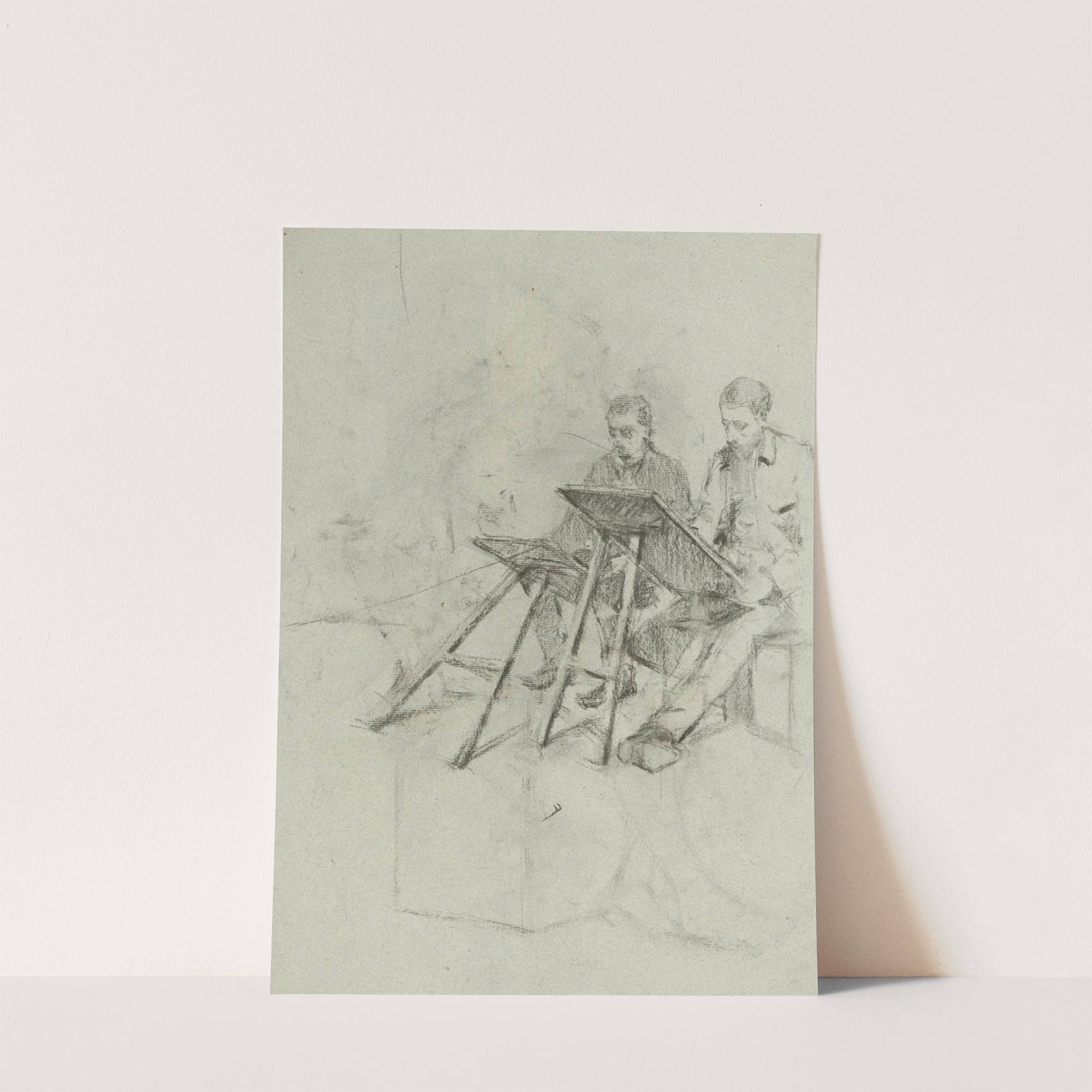 This monochromatic pencil drawing by Ákos Aranyossy titled "Dve mužské postavy" beautifully captures two male figures seated side by side, engrossed in their work. Both men are depicted with a minimalist yet expressive approach, emphasizing the quiet concentration and bond...