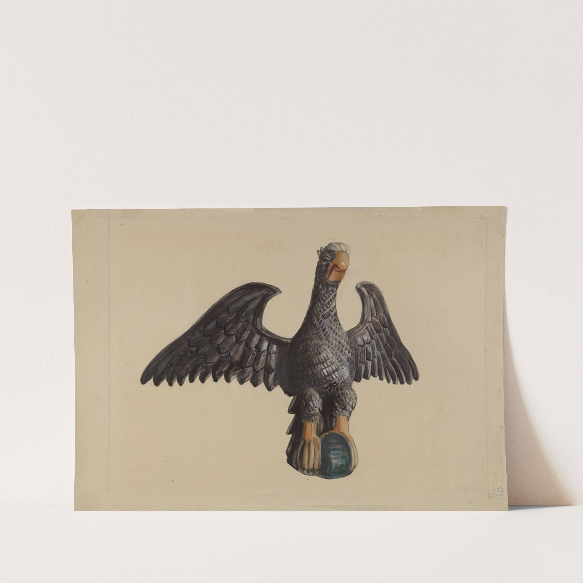 This captivating art print features "Eagle" by Mina Lowry, showcasing a beautifully detailed bird sculpture with an intriguing blend of realism and stylization. The eagle is depicted in mid-flight, wings spread wide, revealing intricate feather patterns in dark charcoal shades...