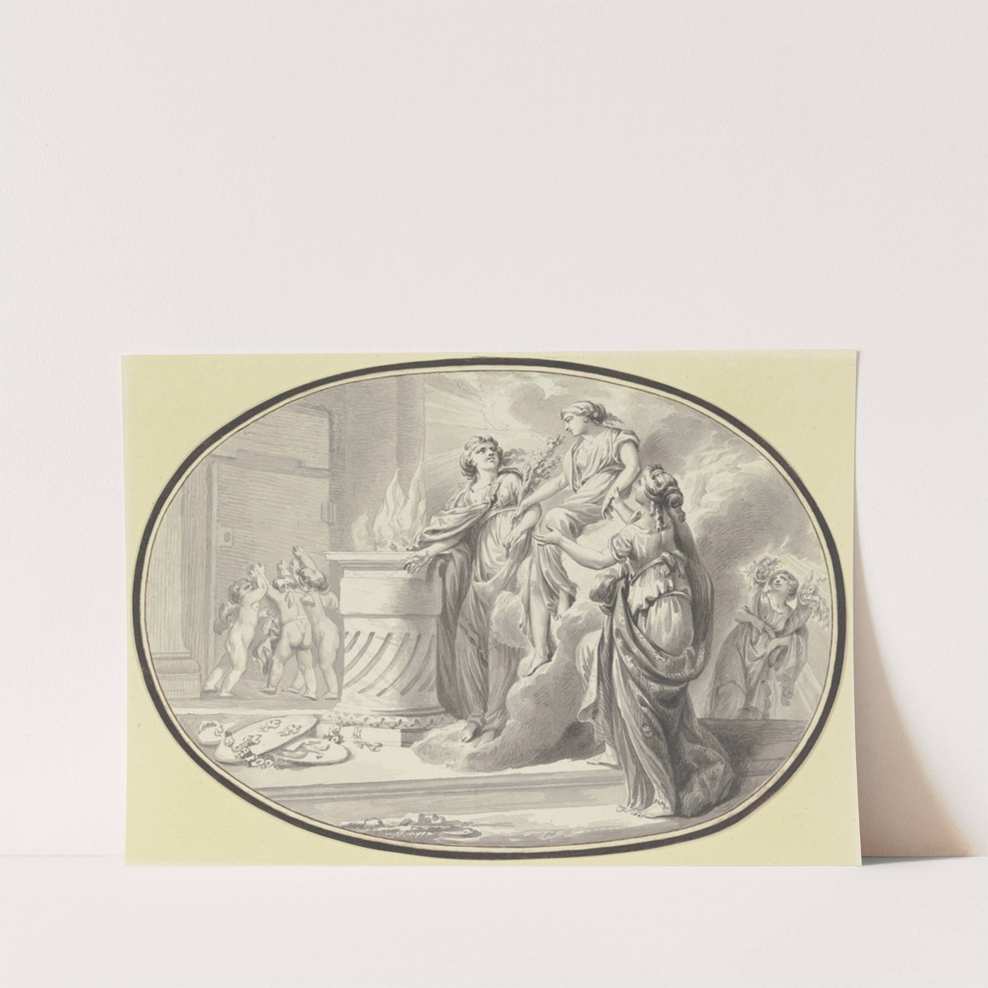 Eine Vestalin zwischen zwei Gefährtinnen vor einem Altar von einer Wolke herabsteigend, im Hintergrund halten drei Amoretten die Tür zum Heiligtum verschlossen by Johann Eleazar Schenau - Wall Art Print