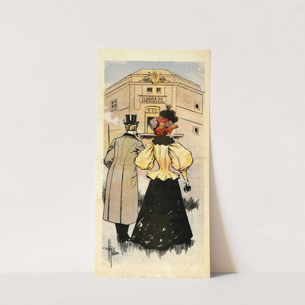 This artwork titled "Eldorado" by Albert Guillaume features a captivating illustration of a man and woman standing in front of a tall building with the word "BANK" displayed on it. The style is reminiscent of early 20th-century art, characterized by...