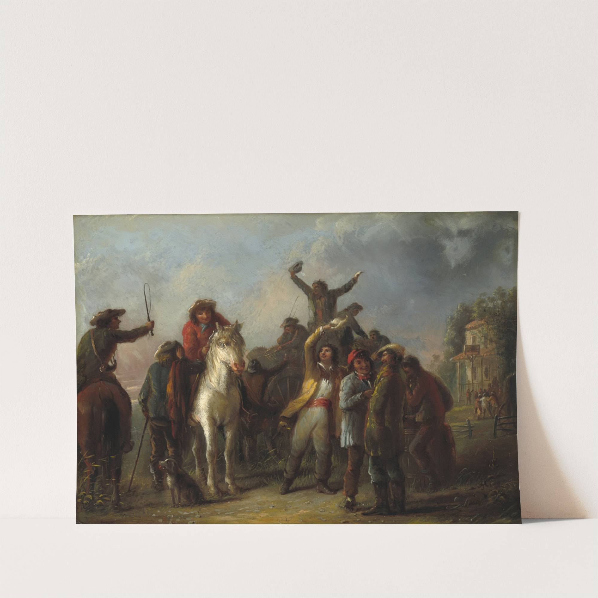 This art print features "Election Scene, Catonsville, Baltimore County" by Alfred Jacob Miller, created in the mid-19th century. The scene depicts a lively gathering of men, some on horseback and others standing, engaged in what appears to be an election...