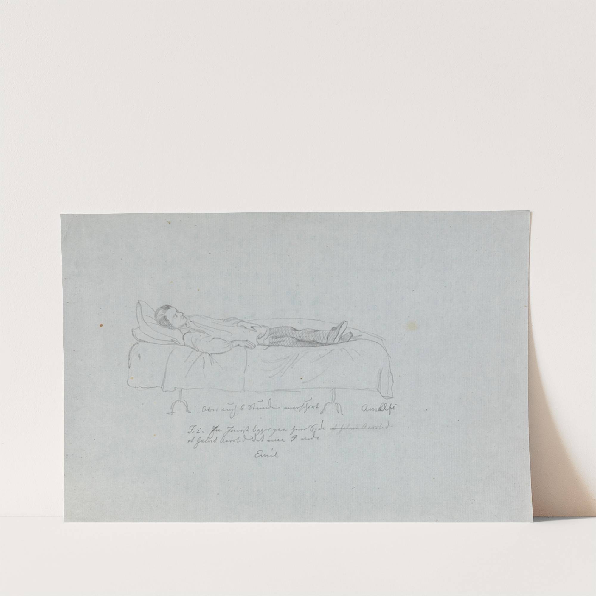 This delicate line drawing is titled "Amalfi" by Adolph Tidemand, created between 1841 and 1842. The artwork features a relaxed man reclining on a simple couch, depicted in fine pencil strokes that convey a sense of calm and leisure. His...