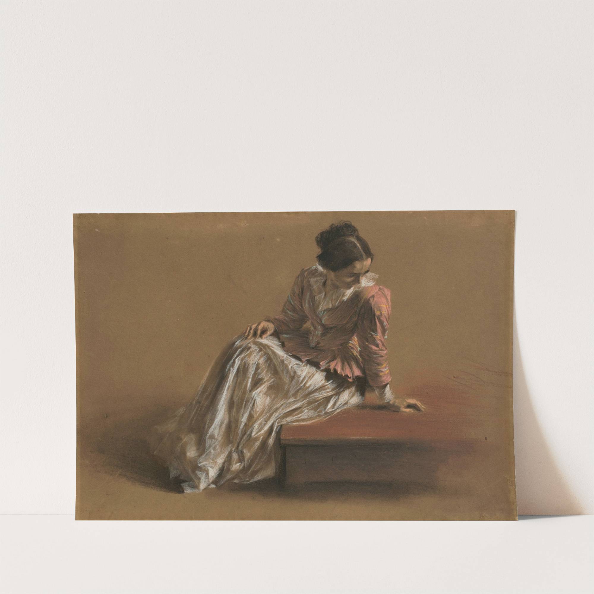 This art print features "Emilie in a Red Blouse" by Adolph von Menzel, a captivating portrait painted in an impressionistic style. The subject is a young woman seated gracefully on a wooden bench against a minimalist brown background. She wears...