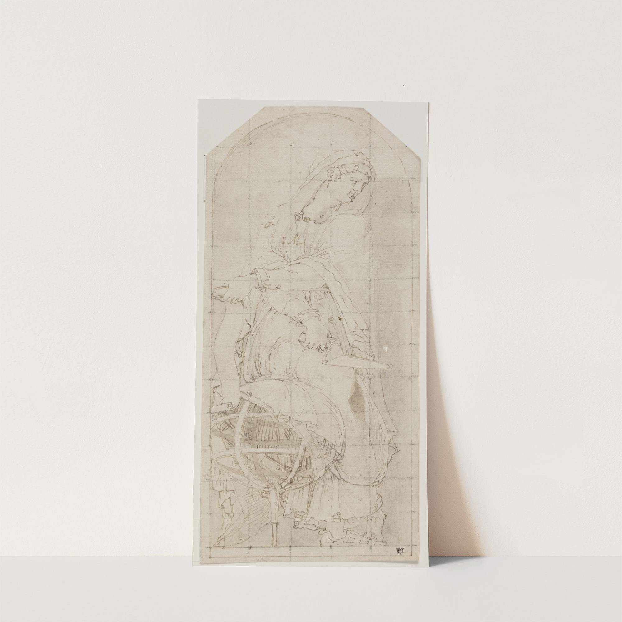 En kvinde med et skriftbånd i venstre og en murske i højre hånd, lænende sig til en himmelglobus by Giovanni Battista Bertani - Wall Art Print