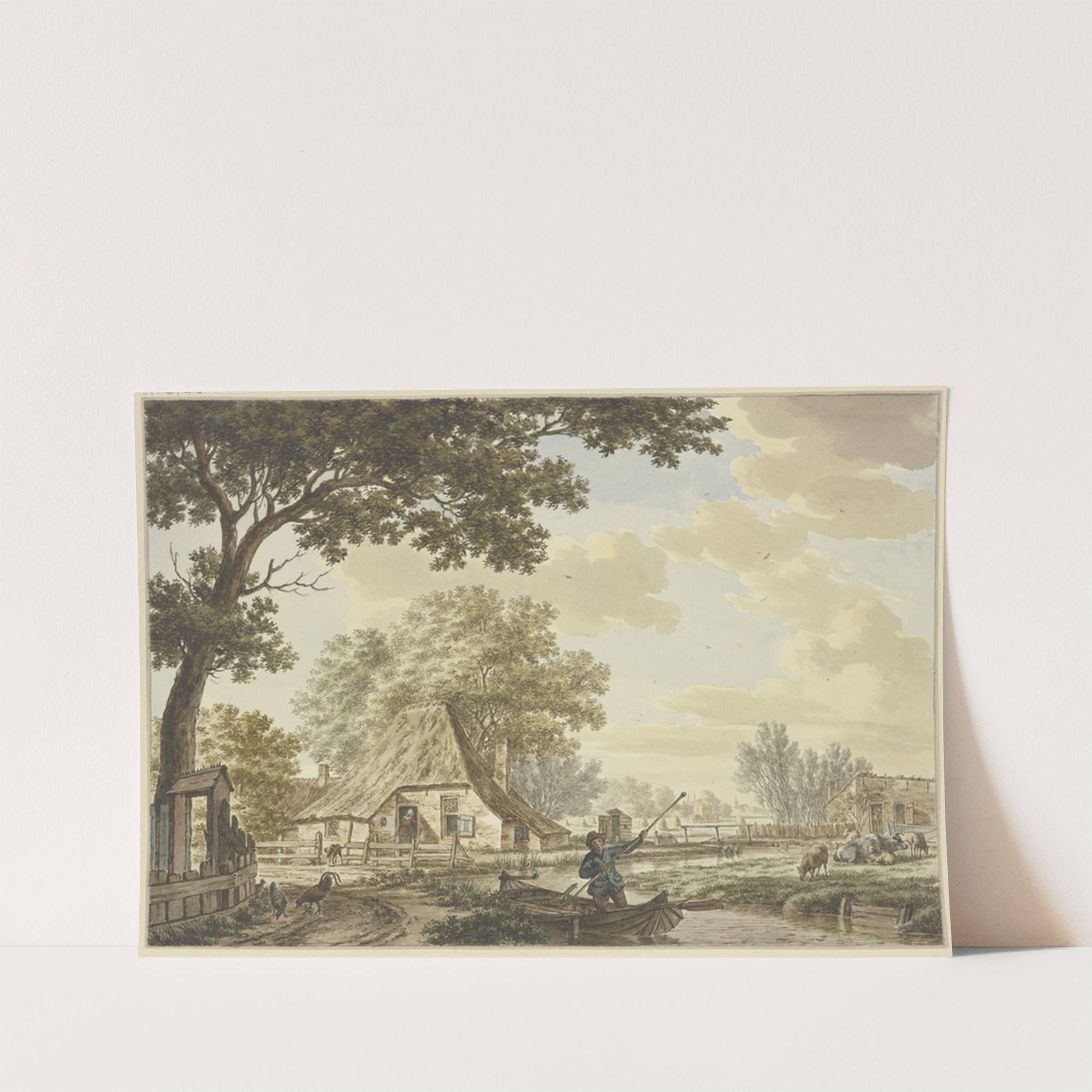 Enger Kanal bei einem Dorf, darauf ein Mann in einem Kahn, rechts Vieh, links Hühner by Jacob Cats - Wall Art Print