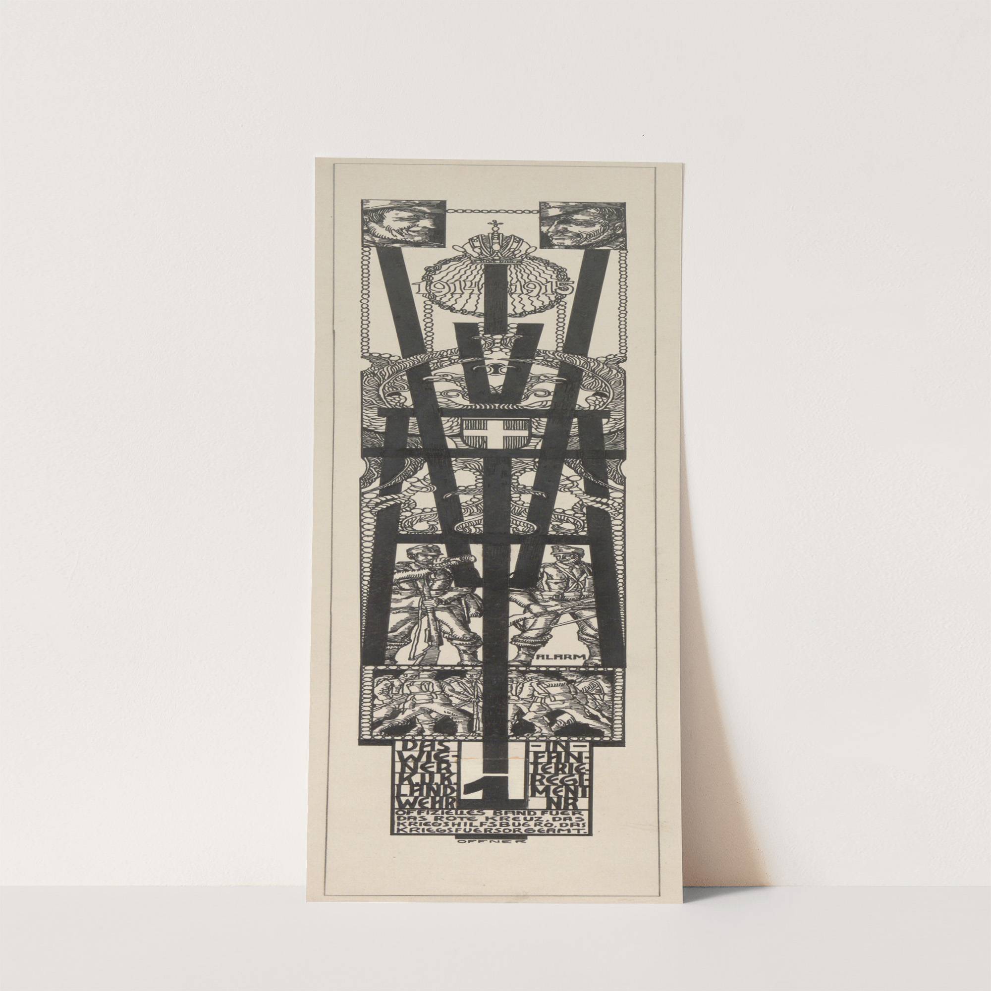 Introducing "Entwurf eines 'Vivatbande' für das Landwehr-Infanterieregiment Nr. 1 (1916)" by Alfred Offner, a striking black and white art print that showcases Offner's intricate and detailed style. This artwork is composed of a vertical arrangement of rectangular panels, each filled...