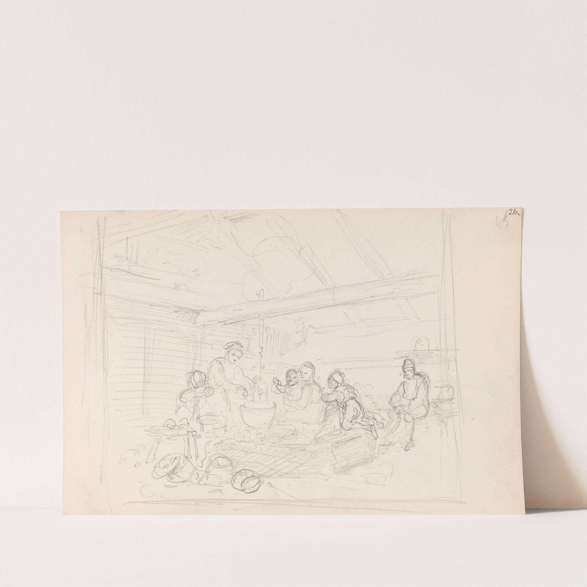 This artwork, "Evening in a Smoking Room" by Adolph Tidemand, features a sketch of several individuals engaged in conversation within a cozy setting. The image is rendered in delicate pencil lines, creating a soft and intimate atmosphere. The central focus...