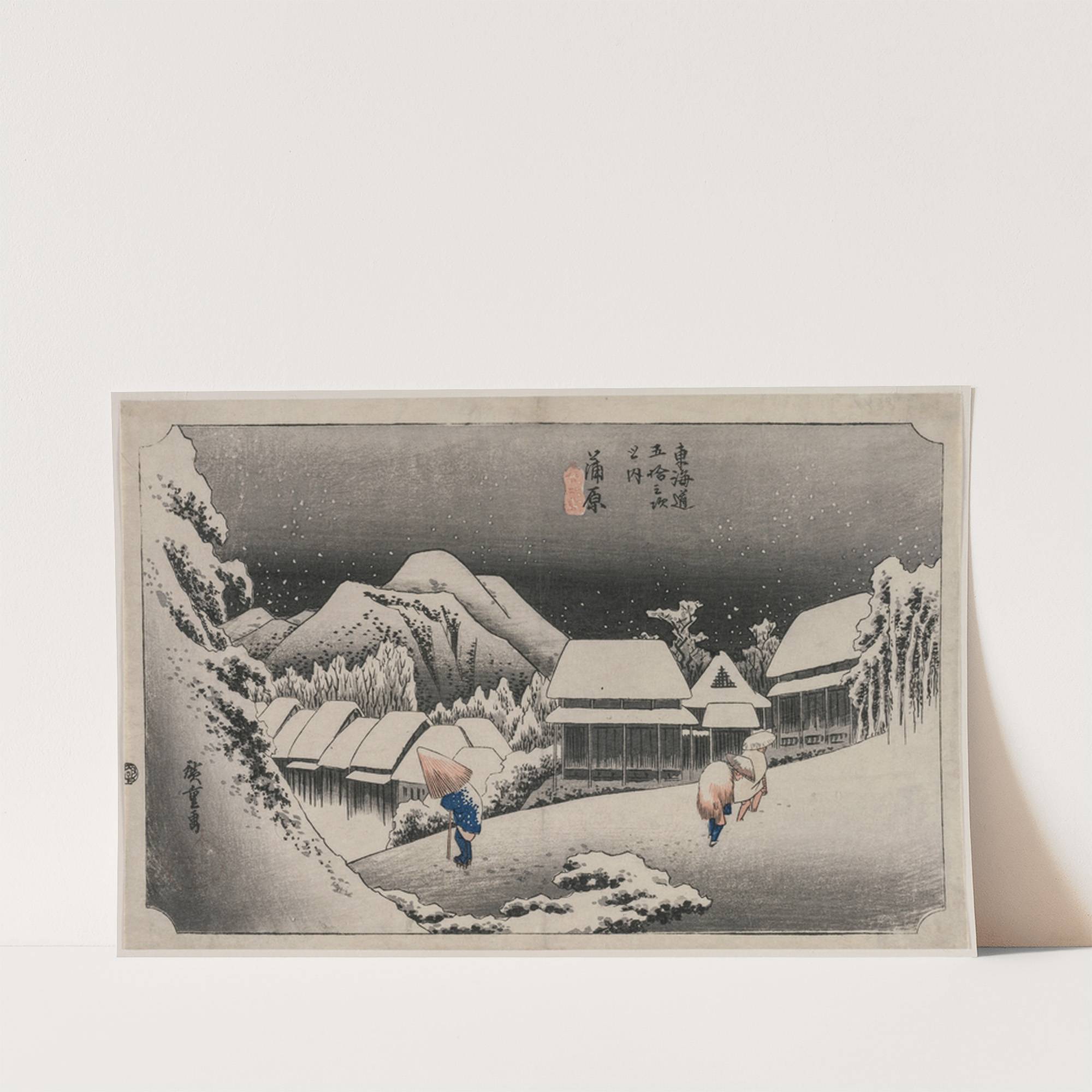 This artwork captures a serene winter scene in the traditional Japanese ukiyo-e style by artist Andō Hiroshige, titled "Evening Snow at Kambara." The composition features two travelers traversing a snowy path towards a row of rustic wooden buildings nestled among...