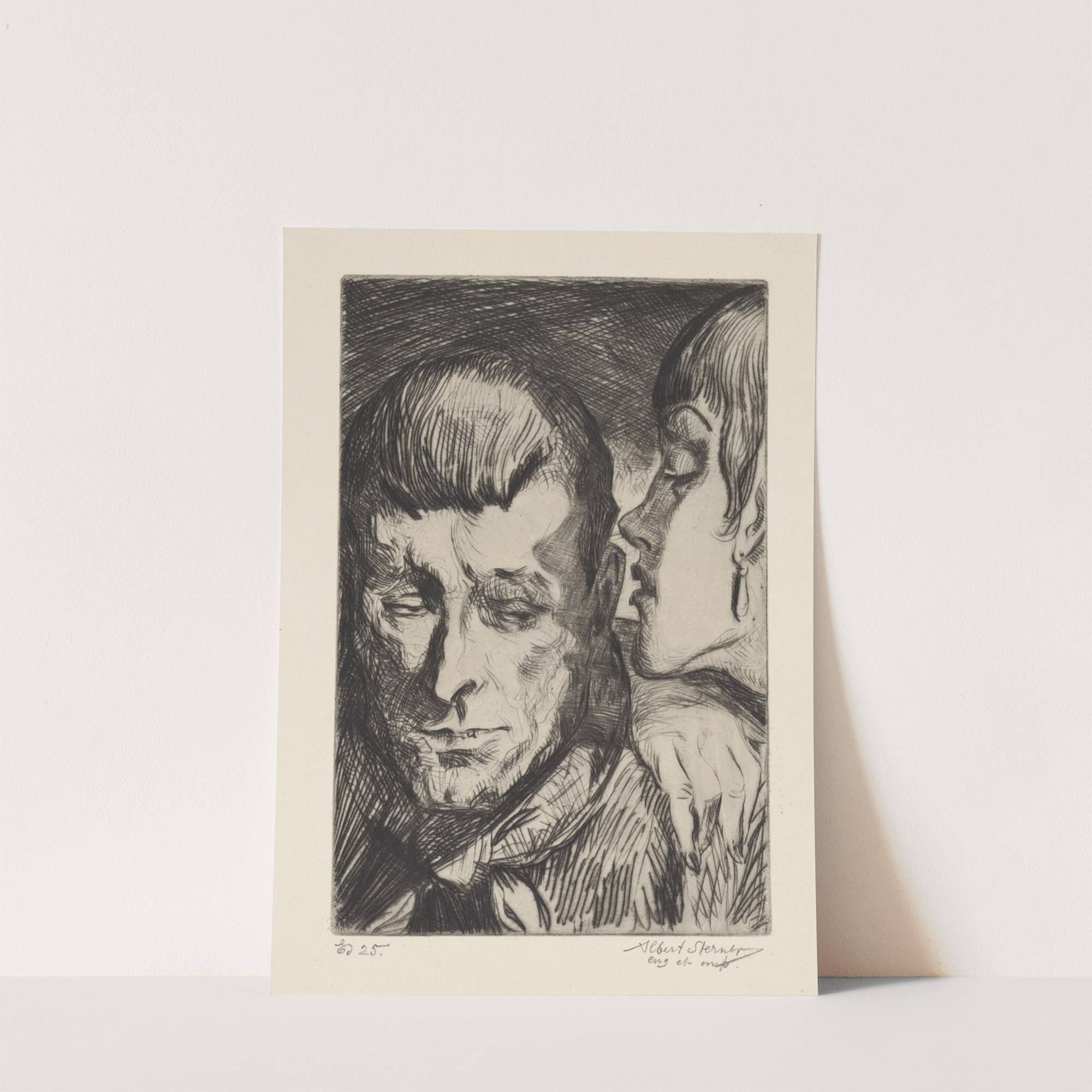 This art print features "Evil Counsel," a striking monochromatic etching by Albert Sterner. The composition captures the intense and emotional interaction between two figures in a close-up portrait. On the left, an elderly man with deeply furrowed brows and a...