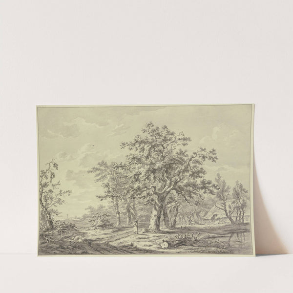 Fahrweg am Rande eines Waldes, rechts im Mittelgrund hinter Bäumen ein strohgedecktes Haus, im Vordergrund eine Holzsammlerin by Carel Lodewijk Hansen - Wall Art Print