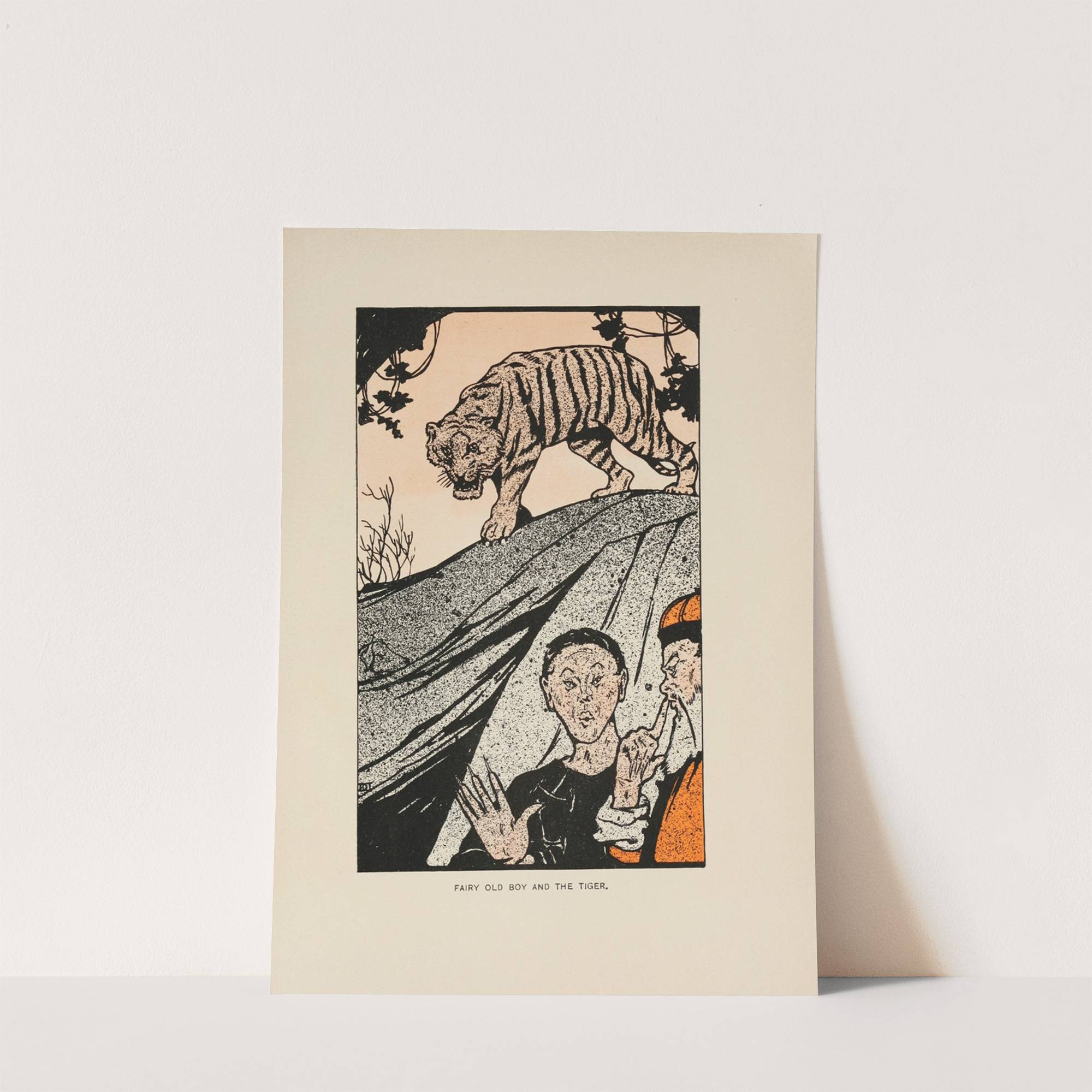 This captivating art print features "Fairy Old Boy and the Tiger" by Norman Hinsdale Pitman. The illustration is rendered in a bold, graphic style with vivid contrasts between black, white, and orange hues. DominatingBelow, a young boy with a gentle,...