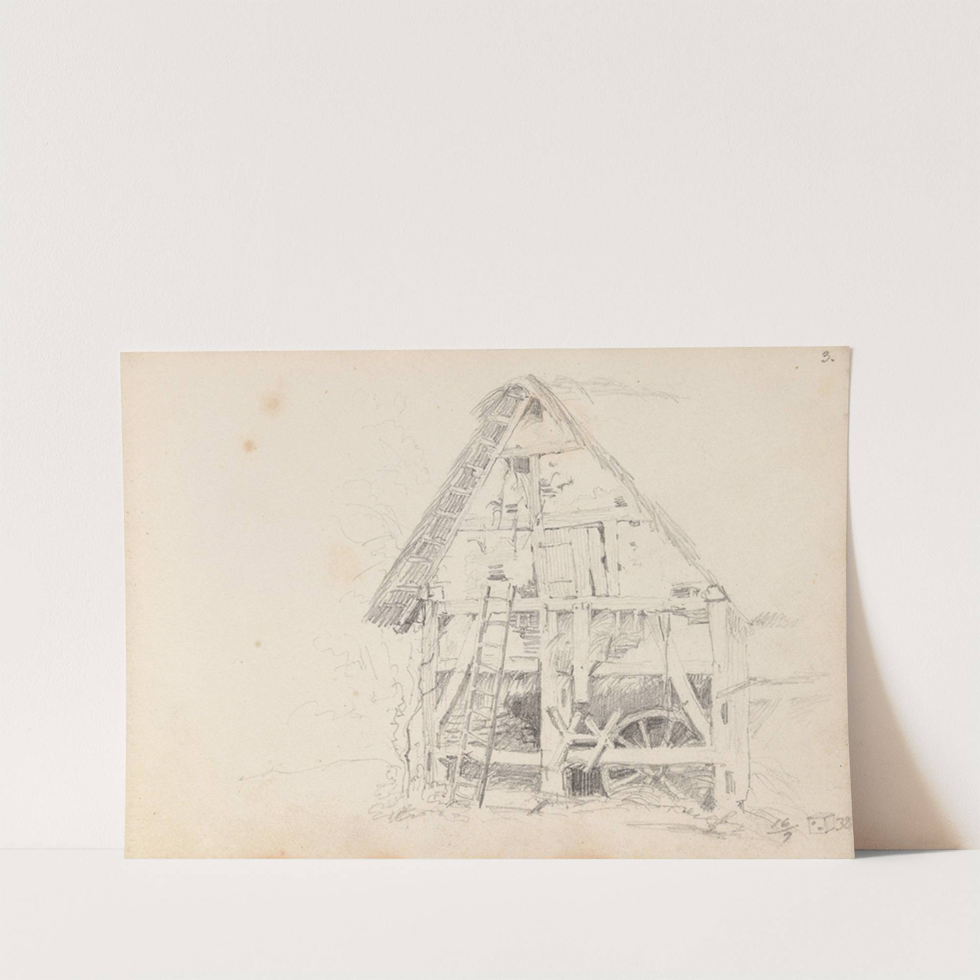 This charming black-and-white sketch captures the rustic simplicity of a traditional wooden windmill in its simplest form. Rendered with delicate pencil strokes, the artist expertly conveys the texture of weathered wood and the angular lines that define the windmill's roof...