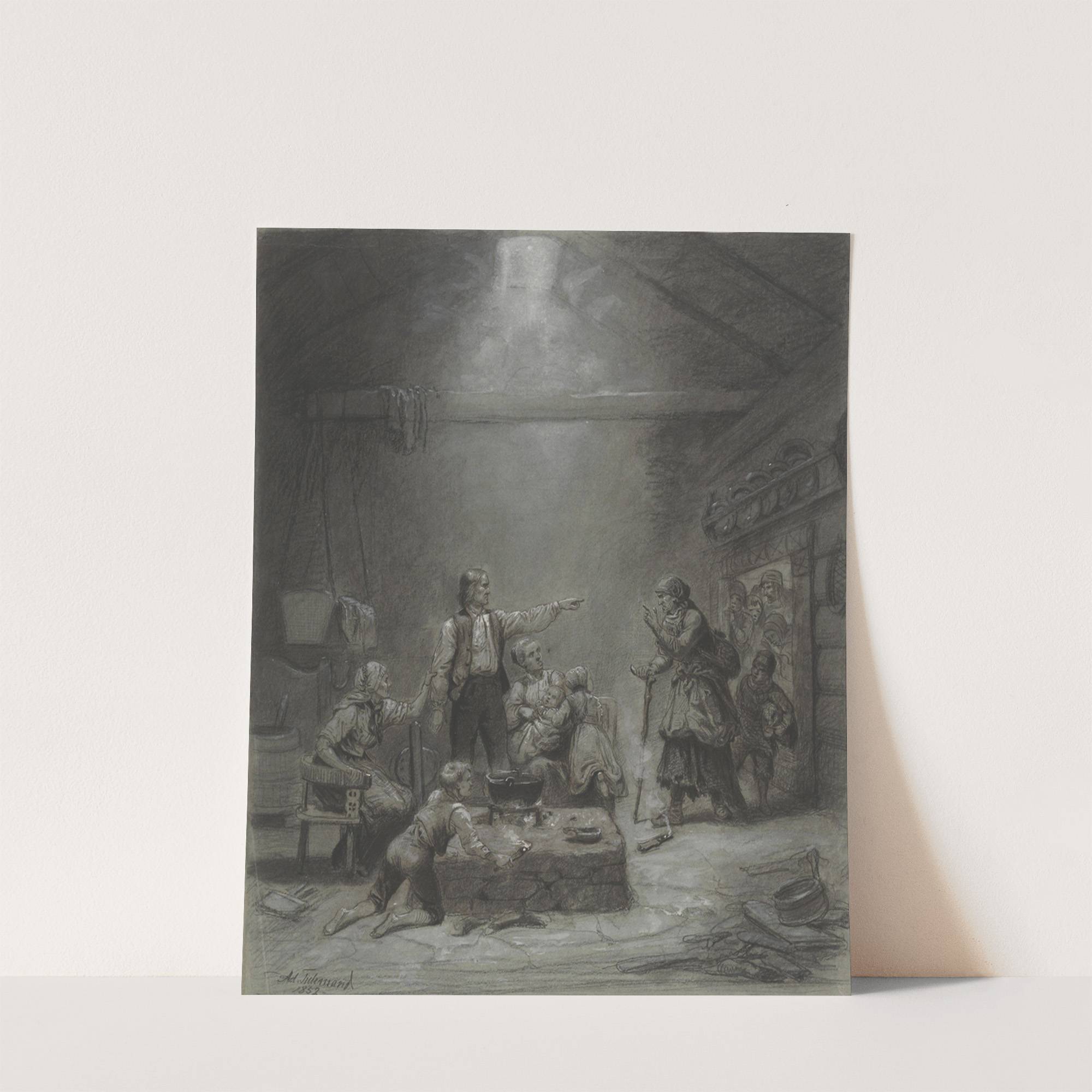 This artwork, "Fantefølge i en bondestue" by Adolph Tidemand, captures a poignant rural scene rendered in grayscale pencil and ink. The setting is a dimly lit rustic barn, where a central male figure stands on a small stool, pointing animatedly...