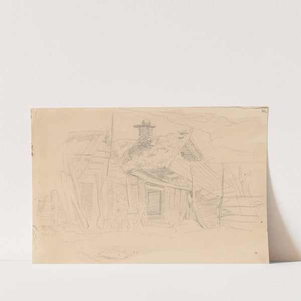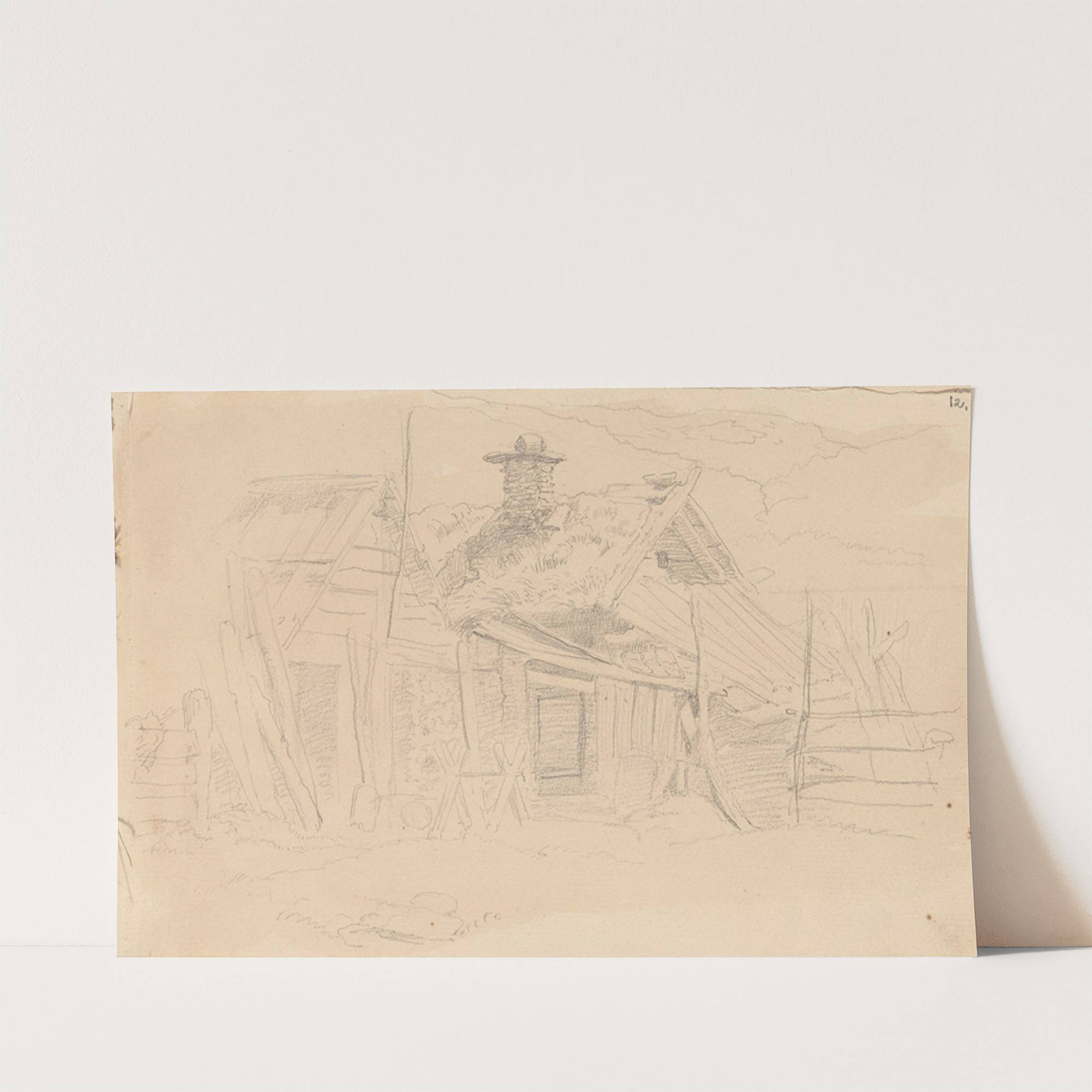 This art print features a delicate pencil sketch of a rustic farmhouse from the period between 1855 to 1857, created by the artist Adolph Tidemand. The image captures the charm of a simpler time with meticulous line work that showcases...