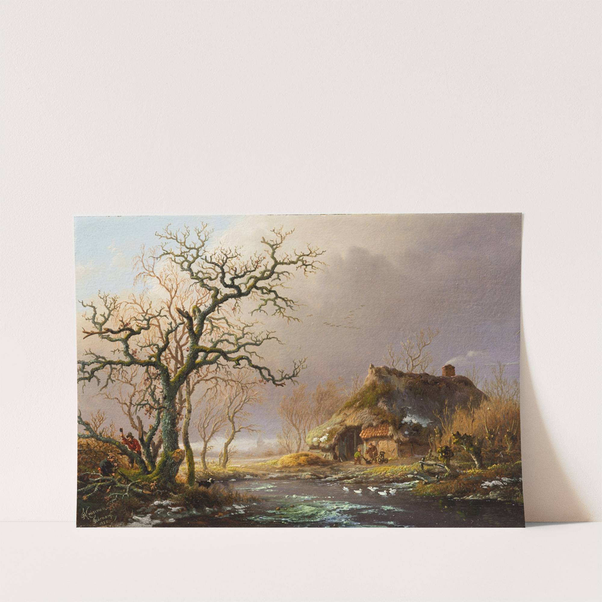 This stunning art print features "February (1855)" by Fredrik Marinus Kruseman, showcasing a beautifully atmospheric winter landscape scene. The painting depicts an old rustic cottage nestled among leafless trees on the right side of the composition, with its thatched roof...
