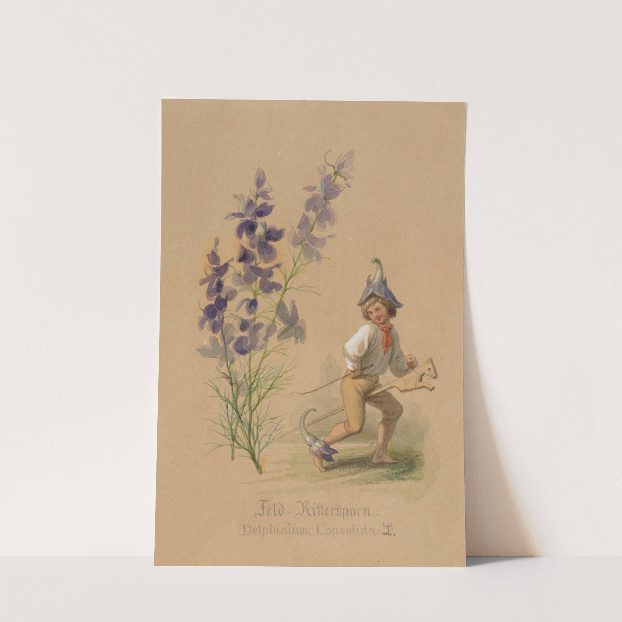 This beautifully illustrated print titled "Feld-Ritterporn" by Adolf Schrödter features a charming medieval scene. The focal point is a young boy, dressed in period-appropriate attire, including a blue and white hat, a white shirt with loose sleeves, brown pants, and...