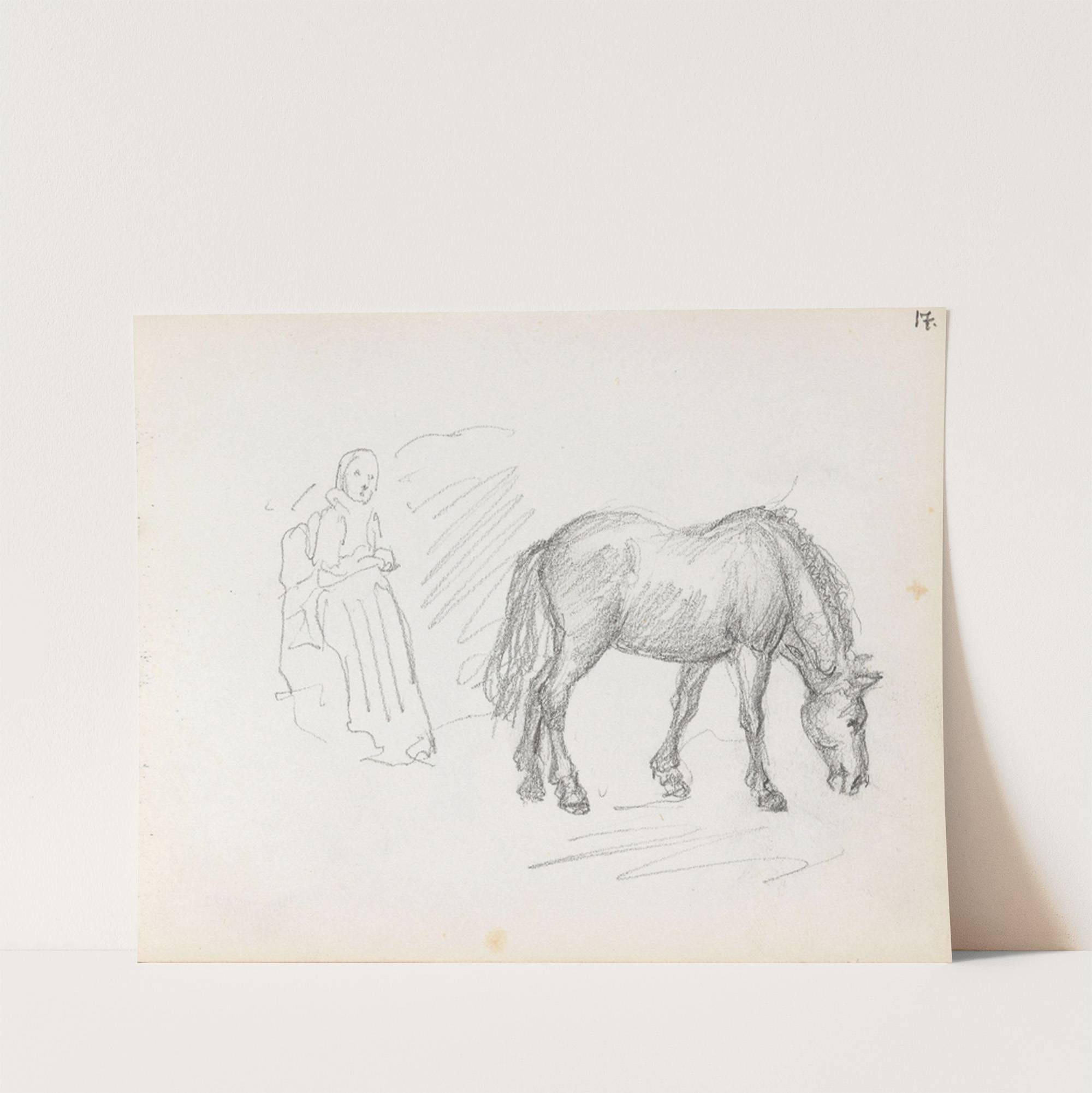 This beautifully rendered pencil sketch captures a serene pastoral scene created by the artist Adolph Tidemand between 1865 and 1872. At the center of this monochromatic artwork is a meticulously detailed horse, grazing with its head lowered to the ground....