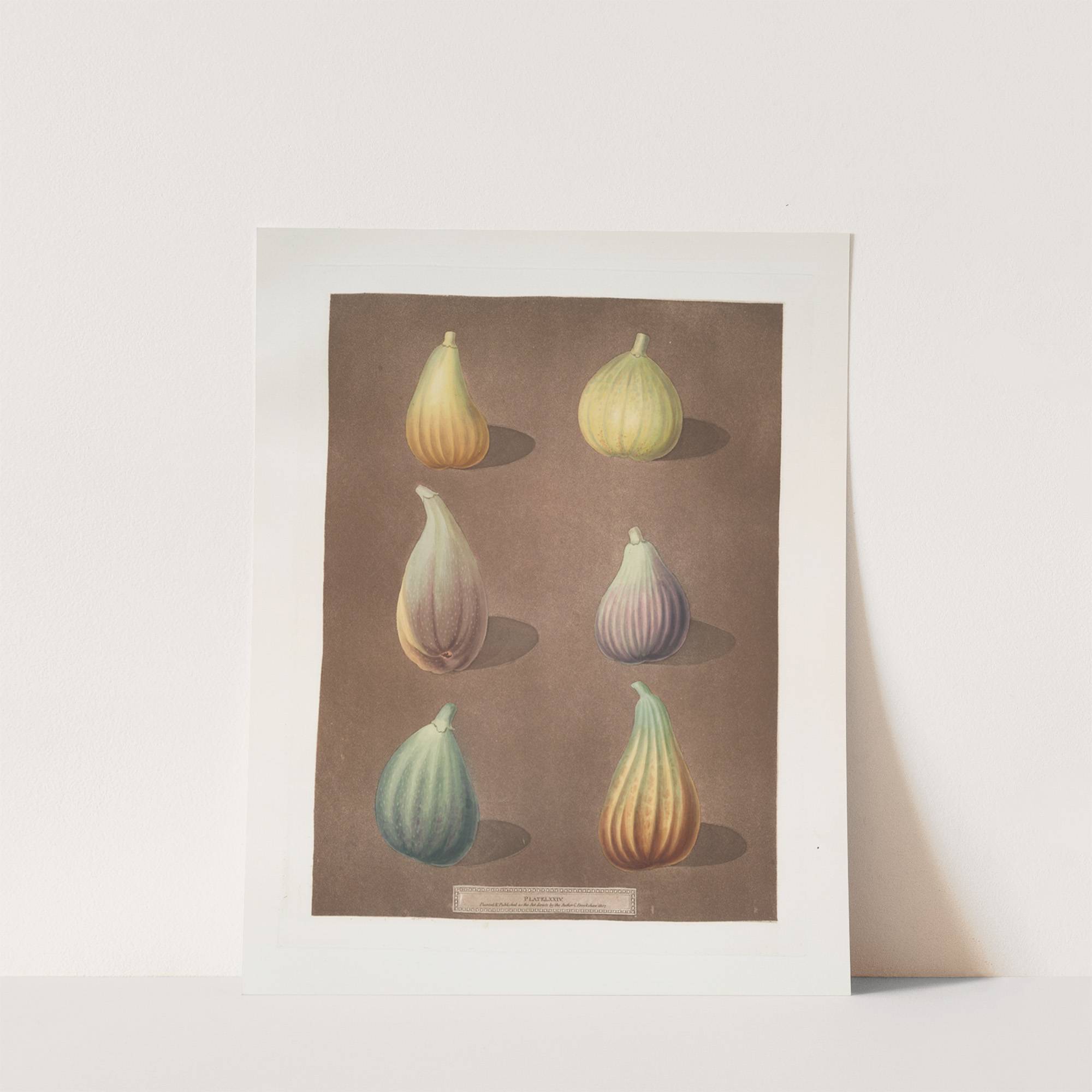 Fig varities (White Hanover, White Marseiles, Brown Naples or Italian, Purple, Green Ischia and the Brunswick). (1812) by George Brookshaw - Wall Art Print