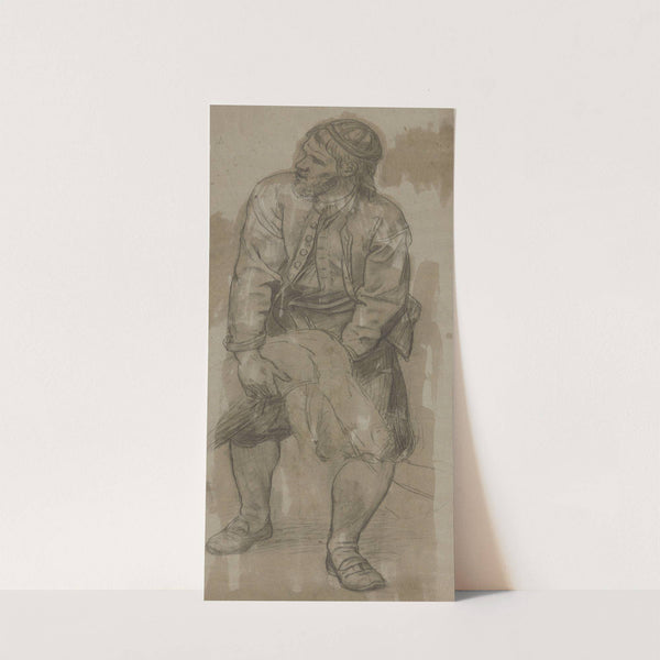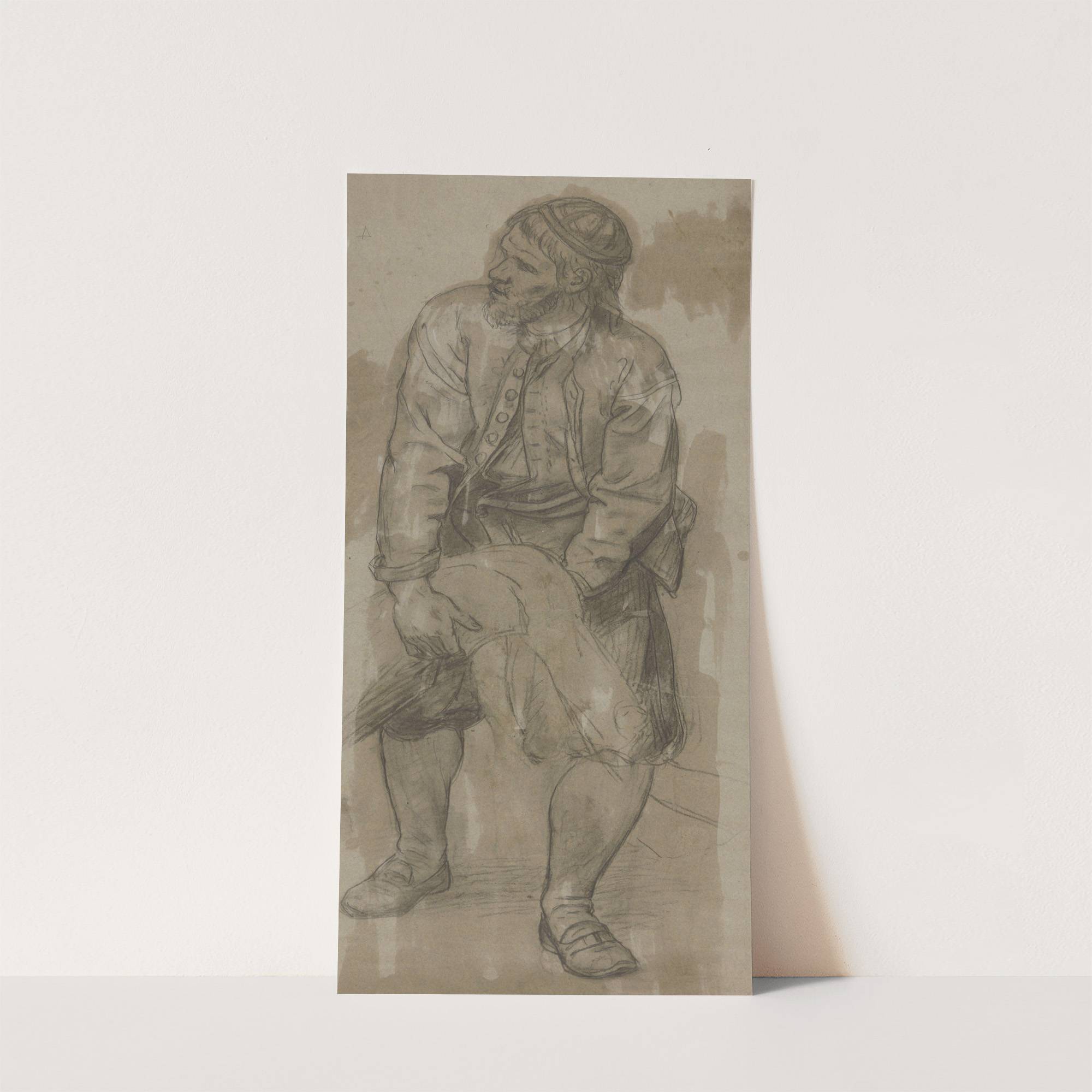 This monochromatic art print features "Figure of a Man Leaning Forward" by Adolph Tidemand, created in 1863. The drawing, executed in pencil on aged paper, showcases a male figure with a contemplative expression, leaning forward slightly as he sits. He...