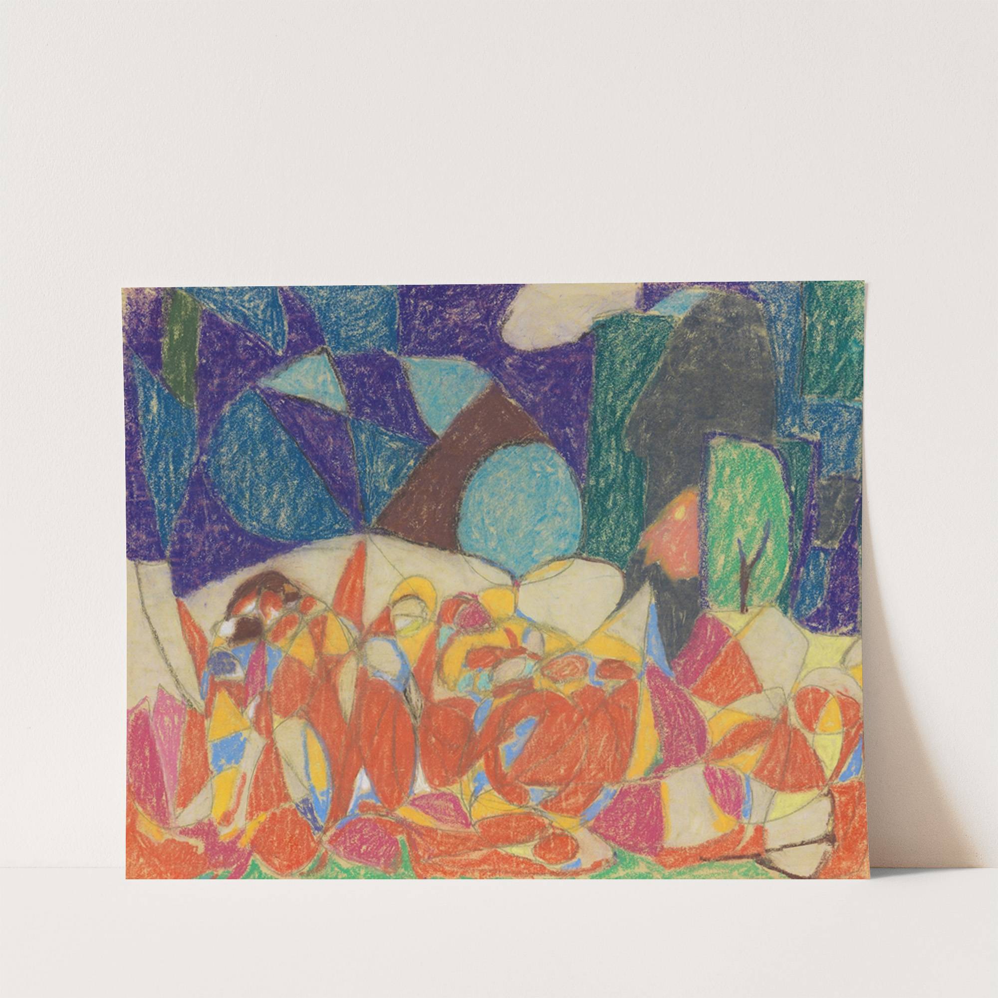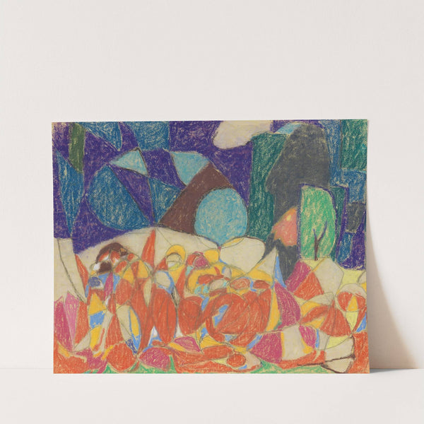 This vibrant art print features "Figurengruppe unter lila-grünen Formen" by Adolf Hölzel. This colorful, abstract painting showcases an explosion of vivid hues including deep blues, bright reds, warm oranges, and cool greens, creating a dynamic and energetic composition. The artist's...