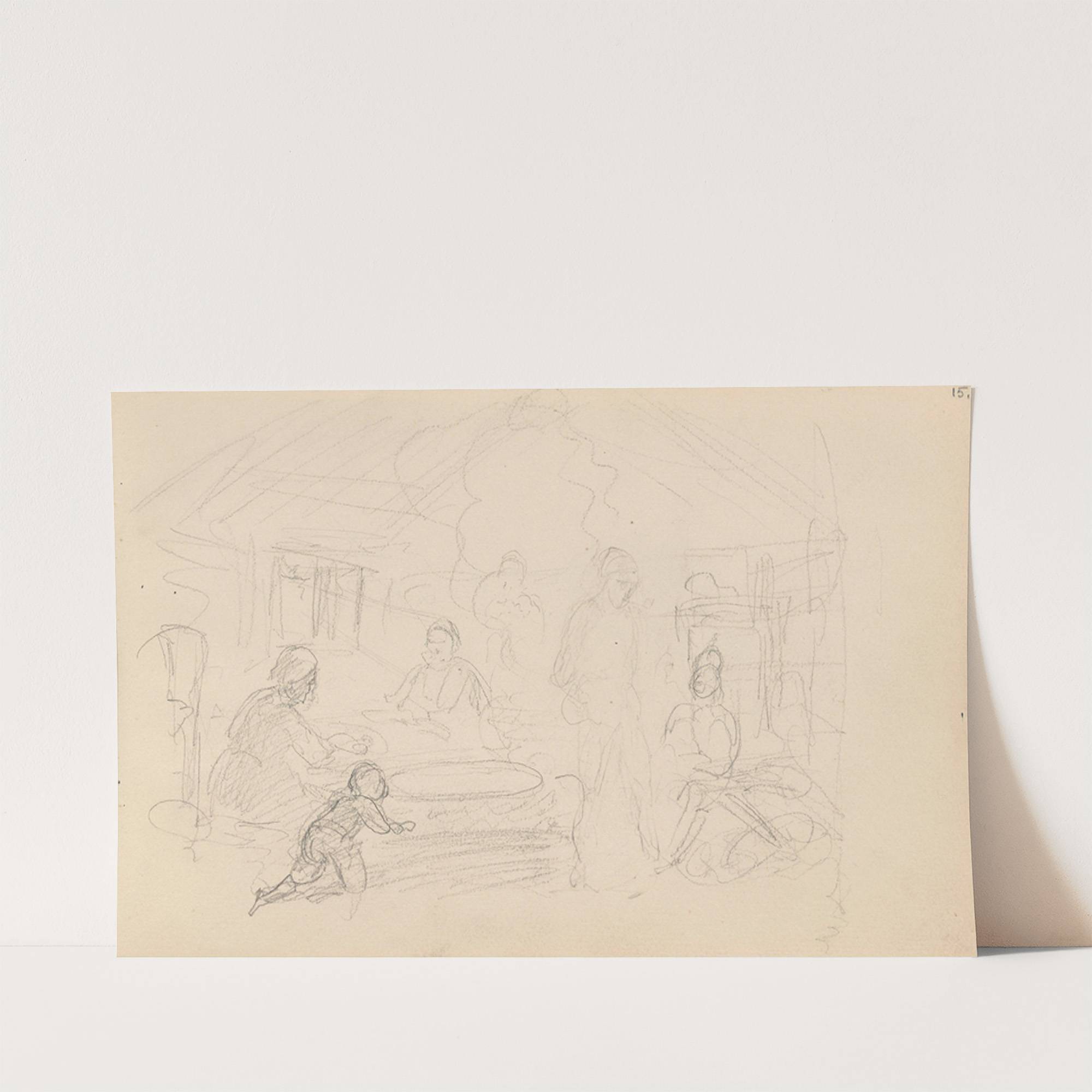This delicate line drawing showcases "Figurer i et ildhus" by Adolph Tidemand, capturing a serene domestic scene with a family gathering. The minimalist pencil sketch is rendered in soft, monochromatic lines against a cream-colored background, emphasizing simplicity and elegance.In the...