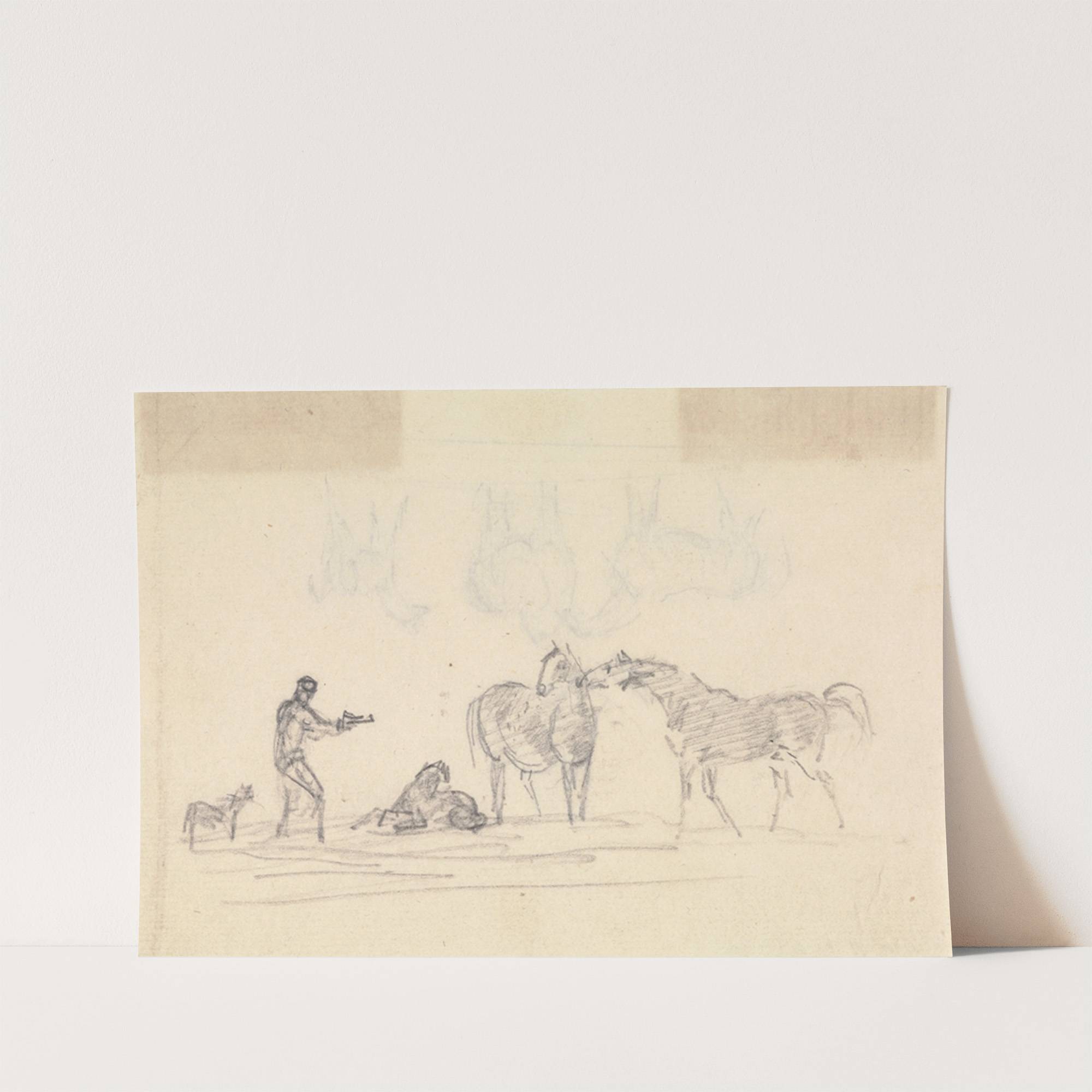 This monochromatic pencil sketch captures "Figures with Horses" by the renowned artist Sawrey Gilpin. The composition features a serene rural scene with three horses standing calmly on a flat surface, while two figures interact in the foreground. A man stands...