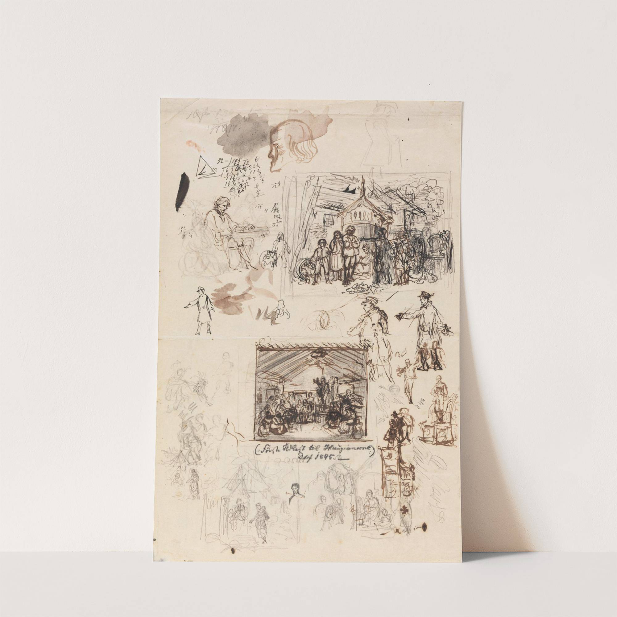 This captivating sketch-style print features the artist's interpretation of "Figurskisser (1845)" by Adolph Tidemand, showcasing a blend of intricate line work and expressive brush strokes in sepia tones. The upper left corner reveals a detailed profile study of a figure...