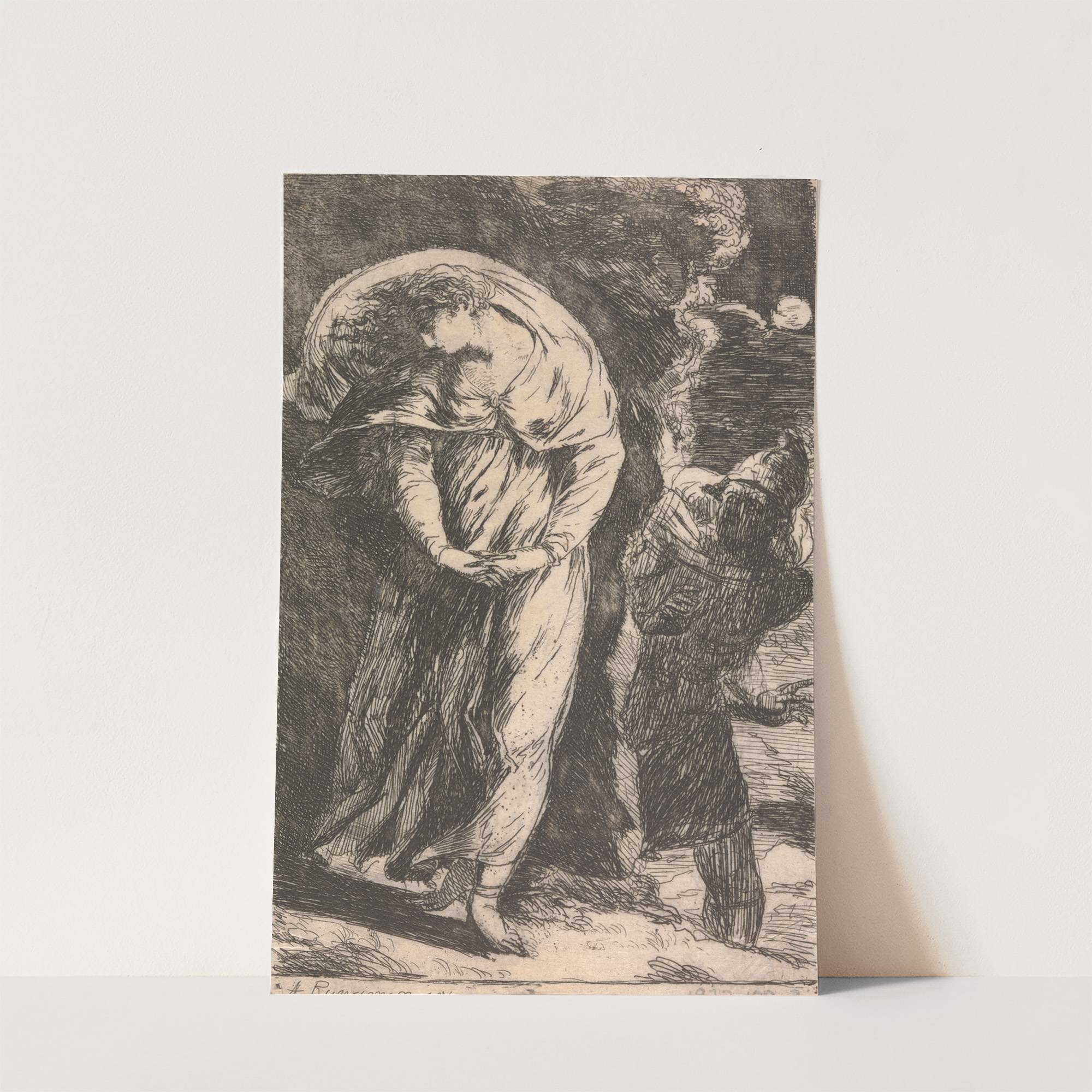 This evocative black-and-white etching, titled "Fingal Discovering Carbon Cargloss" by the renowned artist Alexander Runciman, captures a poignant moment filled with depth and emotional resonance. The central figure is a young woman, her head slightly bowed in a gesture of...