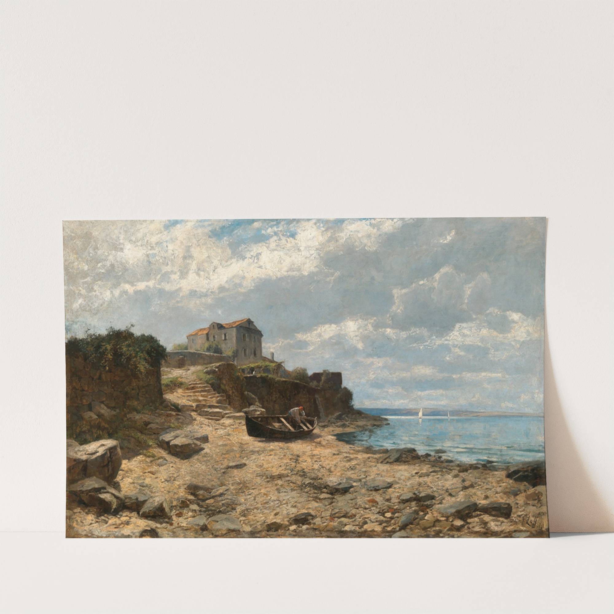 This stunning artwork captures a serene coastal scene titled "Fishermen on the Shore of Valascu" by Alfred Zoff. The painting showcases a rustic seaside landscape with a weathered, two-story house perched atop a rocky cliff in the background, bathed in...