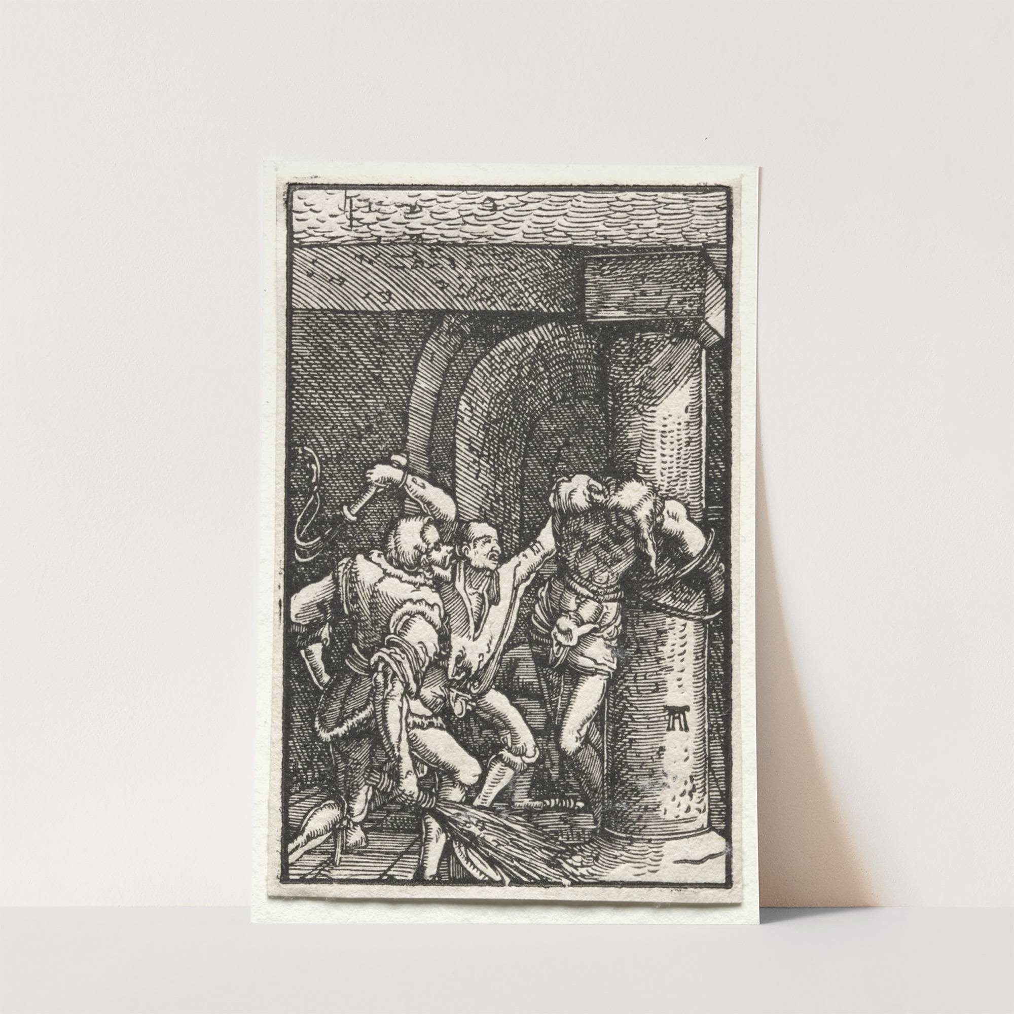 This black-and-white etching features a dramatic and dynamic scene from "Flagellation of Christ" by Albrecht Altdorfer, circa 1515. The detailed illustration depicts multiple figures engaging in the harsh act of flagellation within a dark, cavernous setting with textured walls that...