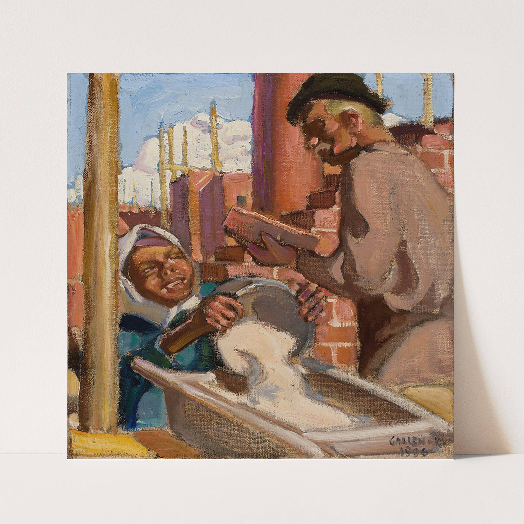 This black-and-white linocut print by Akseli Gallen-Kallela captures a dynamic and tense moment in a rural scene. The composition is rich with details, showcasing a group of men facing an incoming bull from above. The top section features the aggressive...