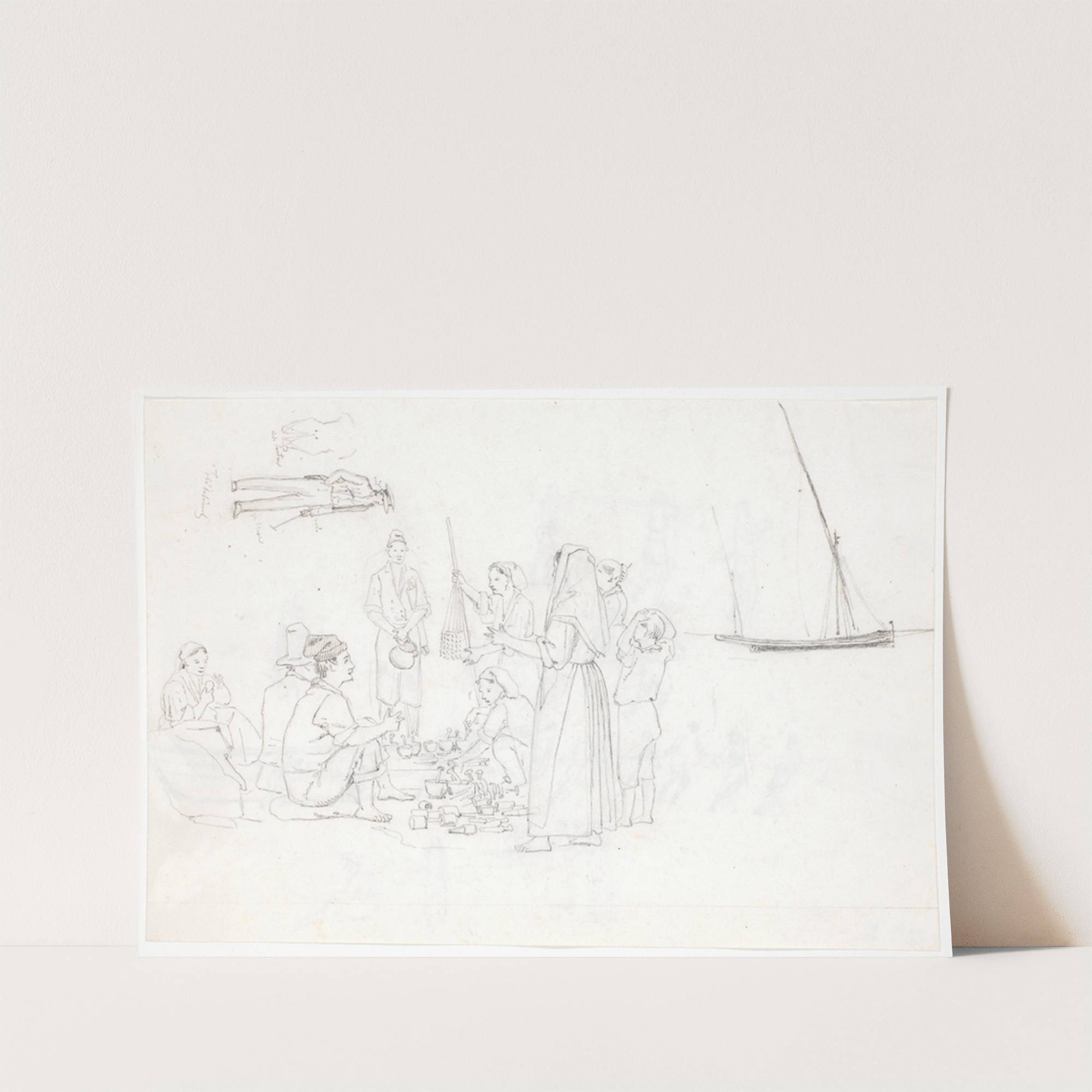 This art print features "Folkelivsstudier" by Martinus Rørbye, showcasing a minimalist yet evocative line drawing style. The composition is sparse with clean, thin lines that outline several figures engaging in various activities. On the left side, multiple small groups interact...