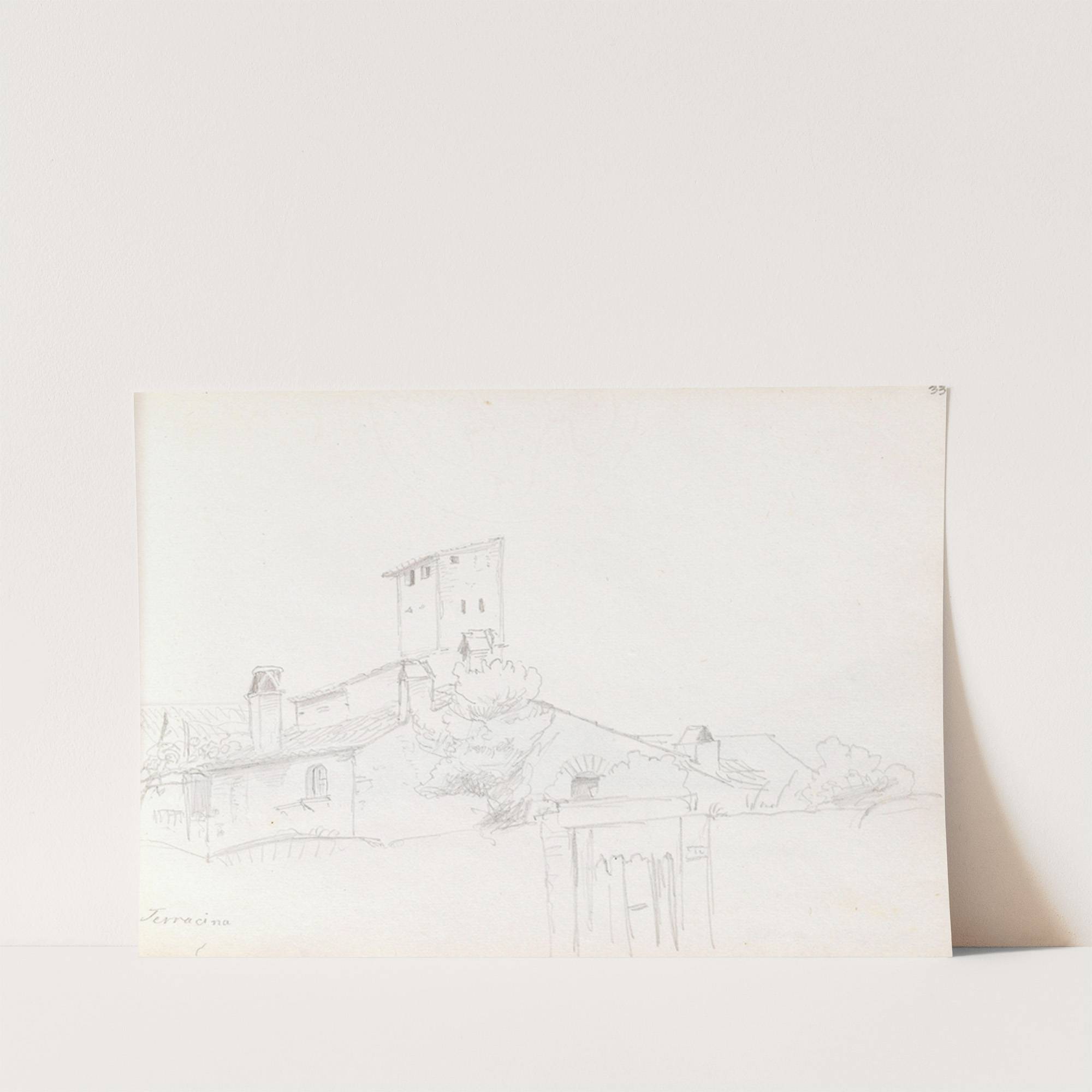 This art print features a minimalist black-and-white line drawing by the artist Fra Terracina, as captured in his work by Adolph Tidemand from 1842. The composition is characterized by intricate linework that depicts an urban landscape with multiple architectural elements,...