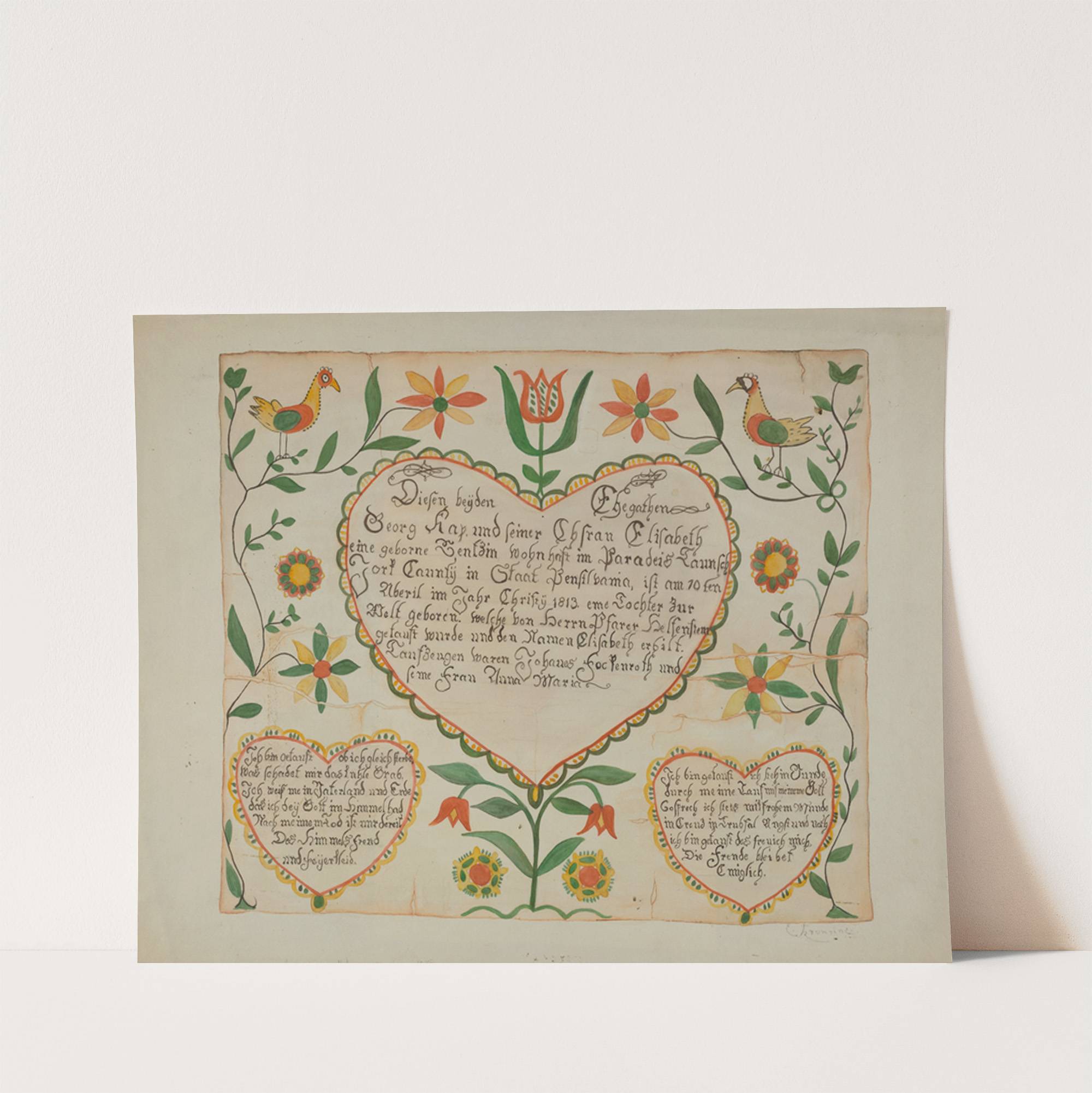 Fraktur – Birth and Baptismal Certificate by Emma M. Krumrine - Wall Art Print