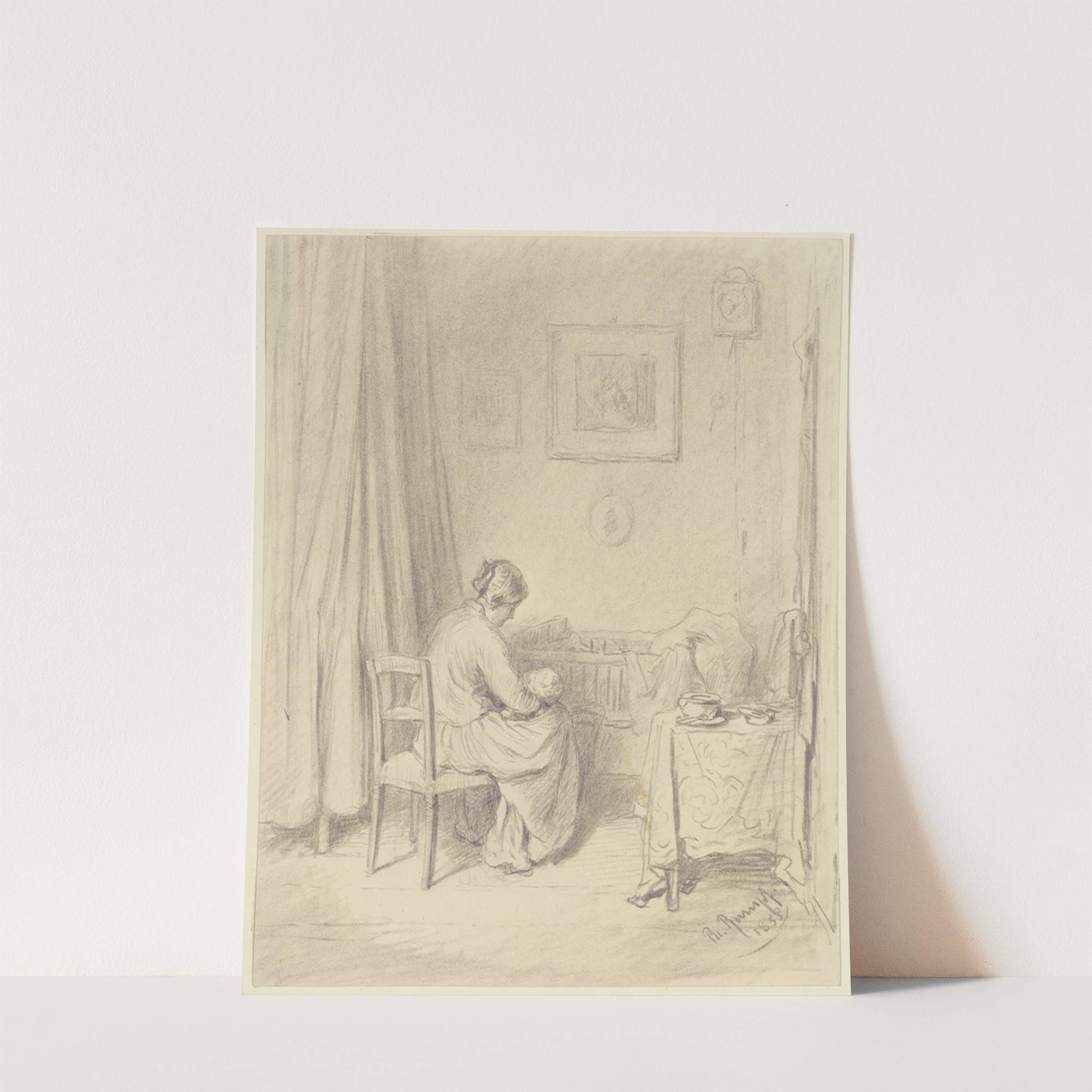 Frau, am Bett eines Kindes sitzend, dieses in ihren Armen in den Schlaf wiegend by Philipp Rumpf - Wall Art Print