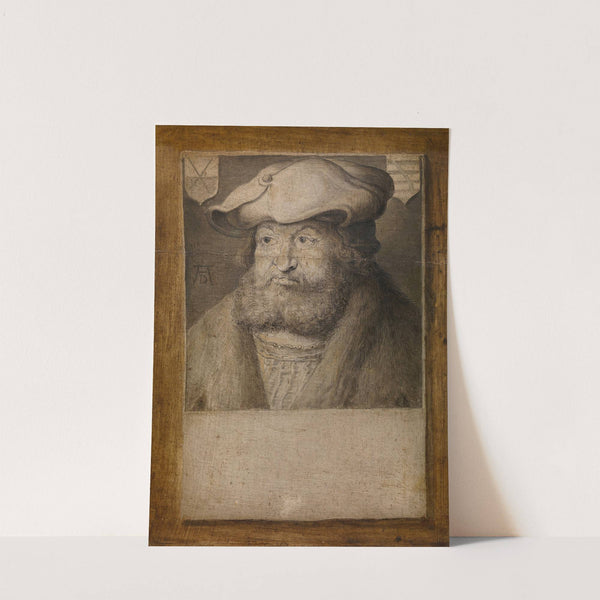 This exquisite print features a meticulously detailed portrait by the renowned artist Albrecht Dürer, depicting Frederick III, Elector of Saxony from the Renaissance period. The artwork showcases a monochromatic palette, with delicate shading and intricate textures that highlight the subject's...