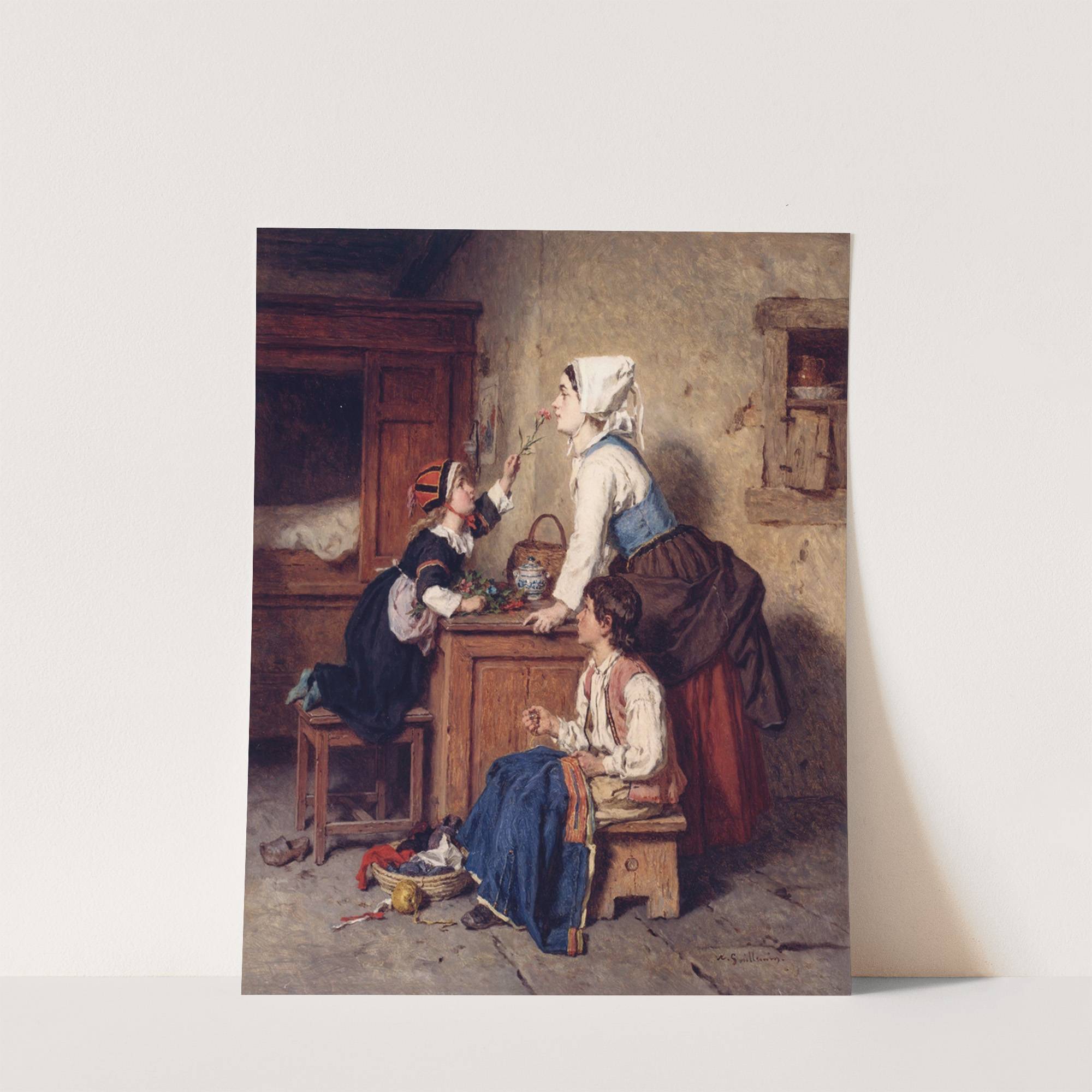 This charming art print features "Freshly Picked" by Alexandre-Marie Guillemin, capturing an idyllic rural scene with rich, earthy tones and soft lighting. Three young women are engaged in domestic chores within a rustic wooden room. The central figure, standing on...