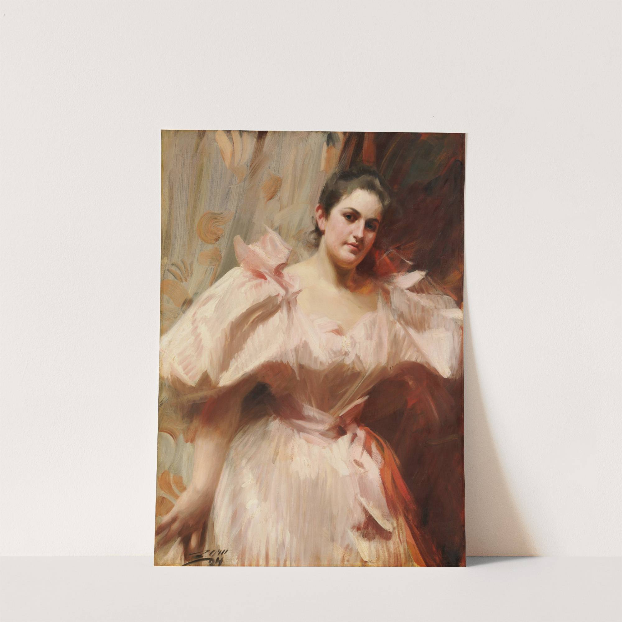 This vibrant painting features a young woman with a soft, contemplative expression, created by artist Frieda Schiff in the style of Anders Zorn. The subject is beautifully depicted in an ethereal white dress adorned with pink ribbons that flutter around...