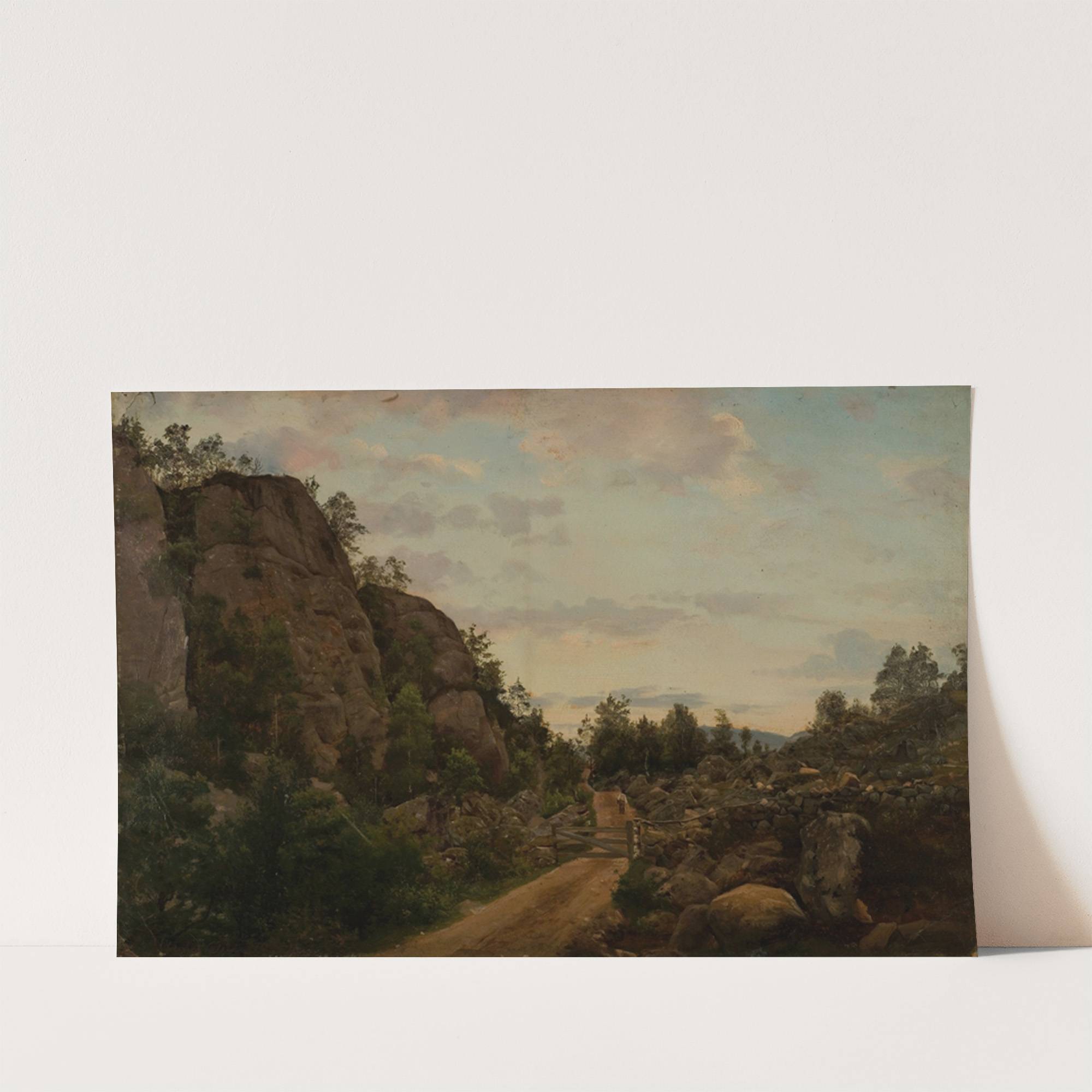 Experience the serene beauty of "Frøislandsveien, Mandal" by Amaldus Nielsen, an exquisite landscape painting that captures the tranquility of nature at dusk. The composition features a rugged dirt path winding its way through a rocky terrain on the left, with...