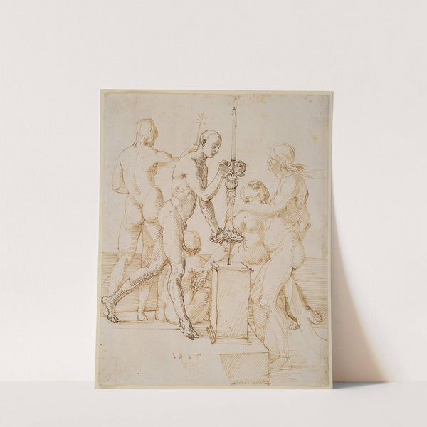 This exquisite monochromatic etching by Albrecht D?rer captures the intricate scene of "F?nf nackte Figuren um einen brennenden Leuchter." The artwork features five nude male figures engaged in a ritualistic activity centered around a burning candle. Each figure is meticulously...