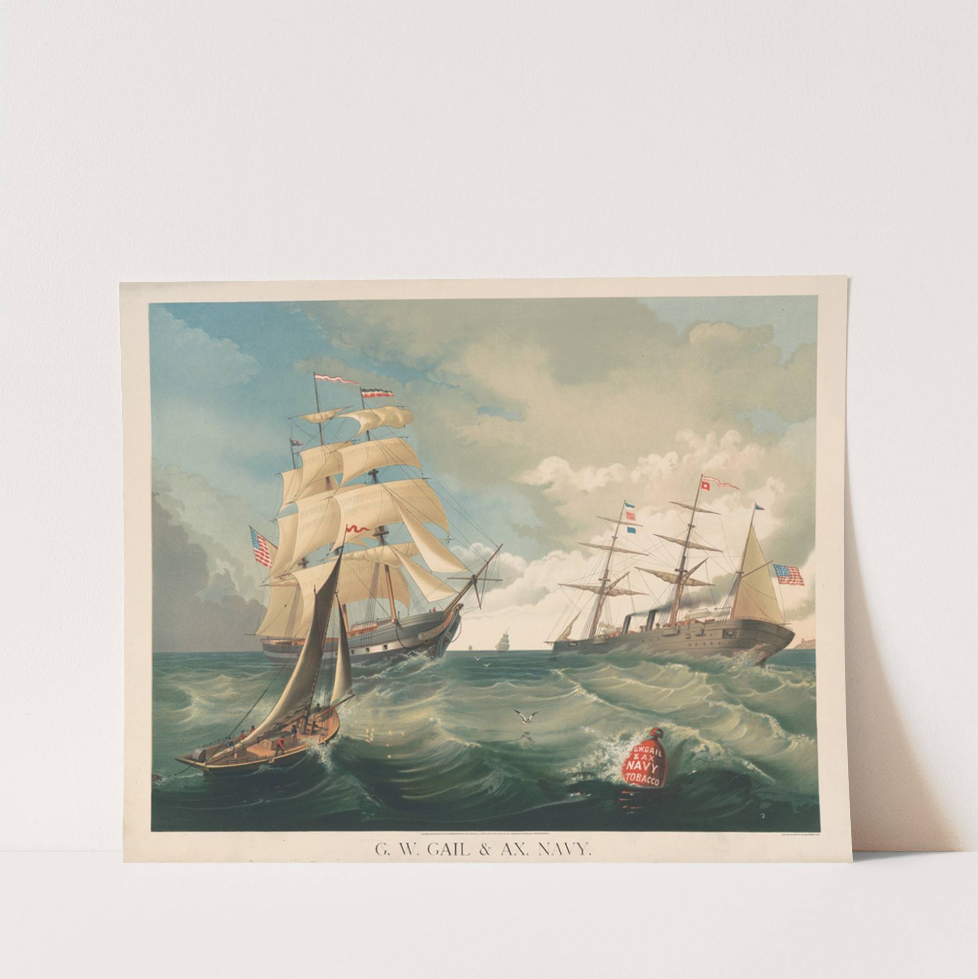 Experience maritime history with this stunning art print of "G.W. Gallagher & Mary". This illustration captures the intensity of a naval battle, depicting two large warships engaged in conflict on a choppy sea. The ship in the foreground has tall...