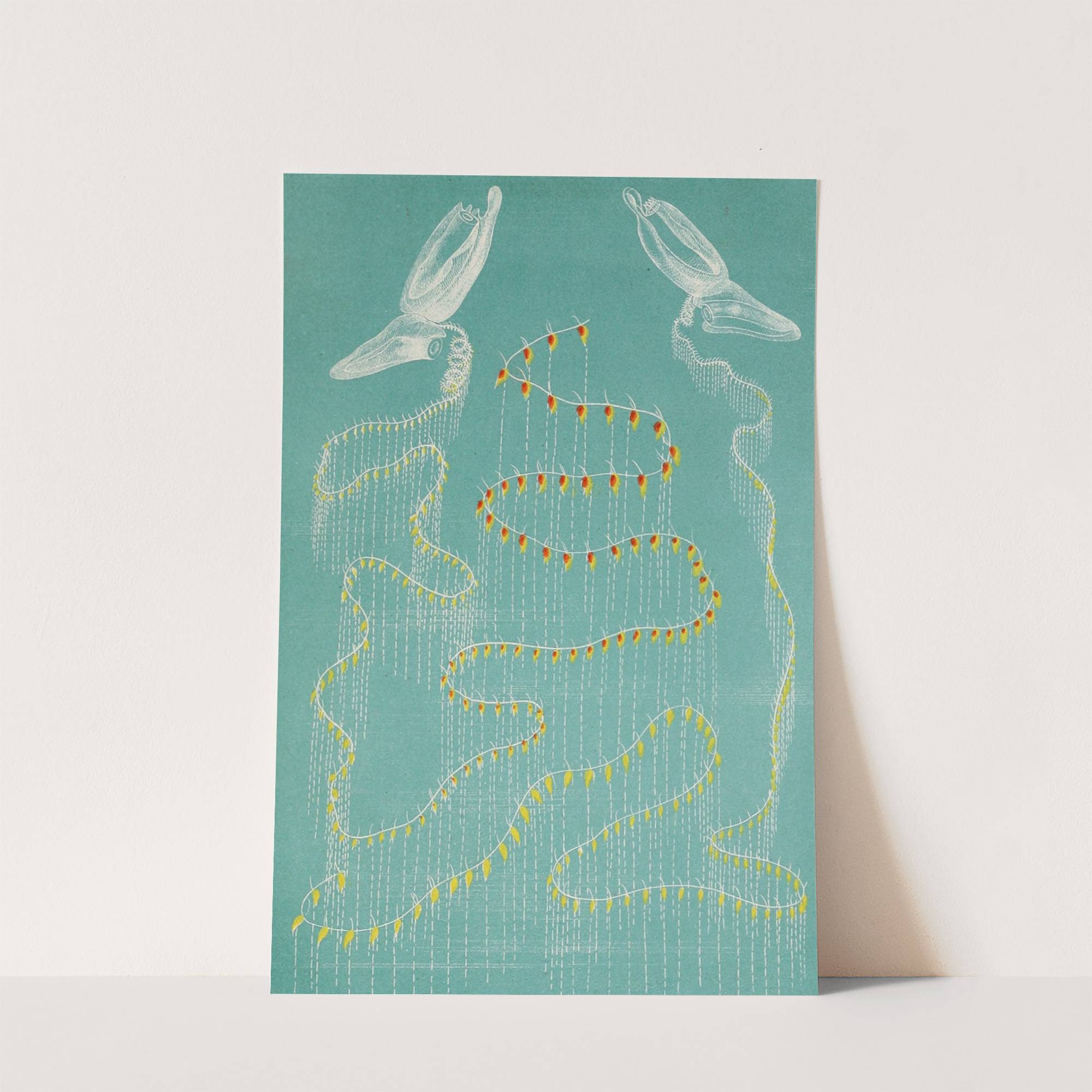 This vibrant artwork titled "Galéolaire orangée" by Alfred Frédol showcases an abstract yet evocative representation of two stylized birds against a serene turquoise background. The artist employs a minimalist style, using white line illustrations to depict the birds in profile,...