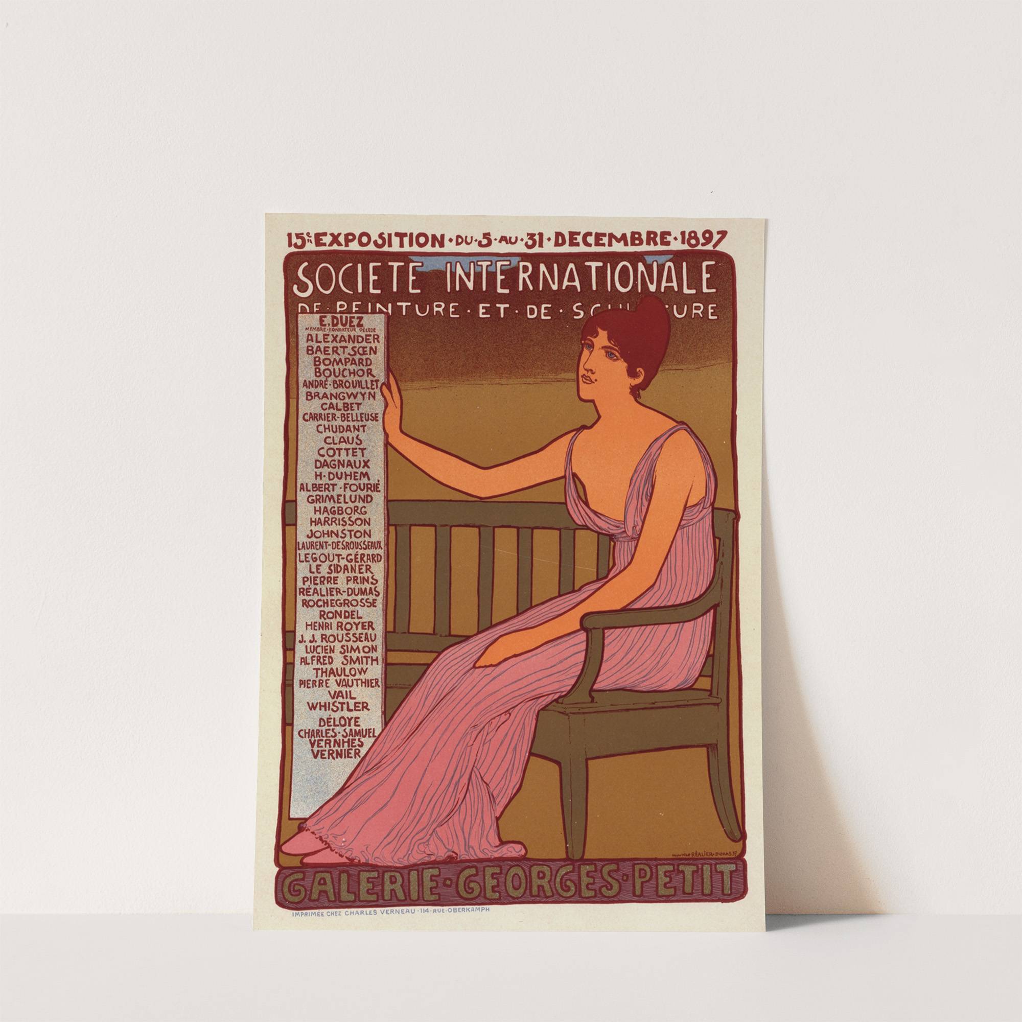 This art print is a reproduction of "Galerie Georges Petit" by Maurice Réalier-Dumas, created in 1907. The artwork features an elegant woman seated on a wooden bench, her left arm raised gracefully as she gazes into the distance. She is...