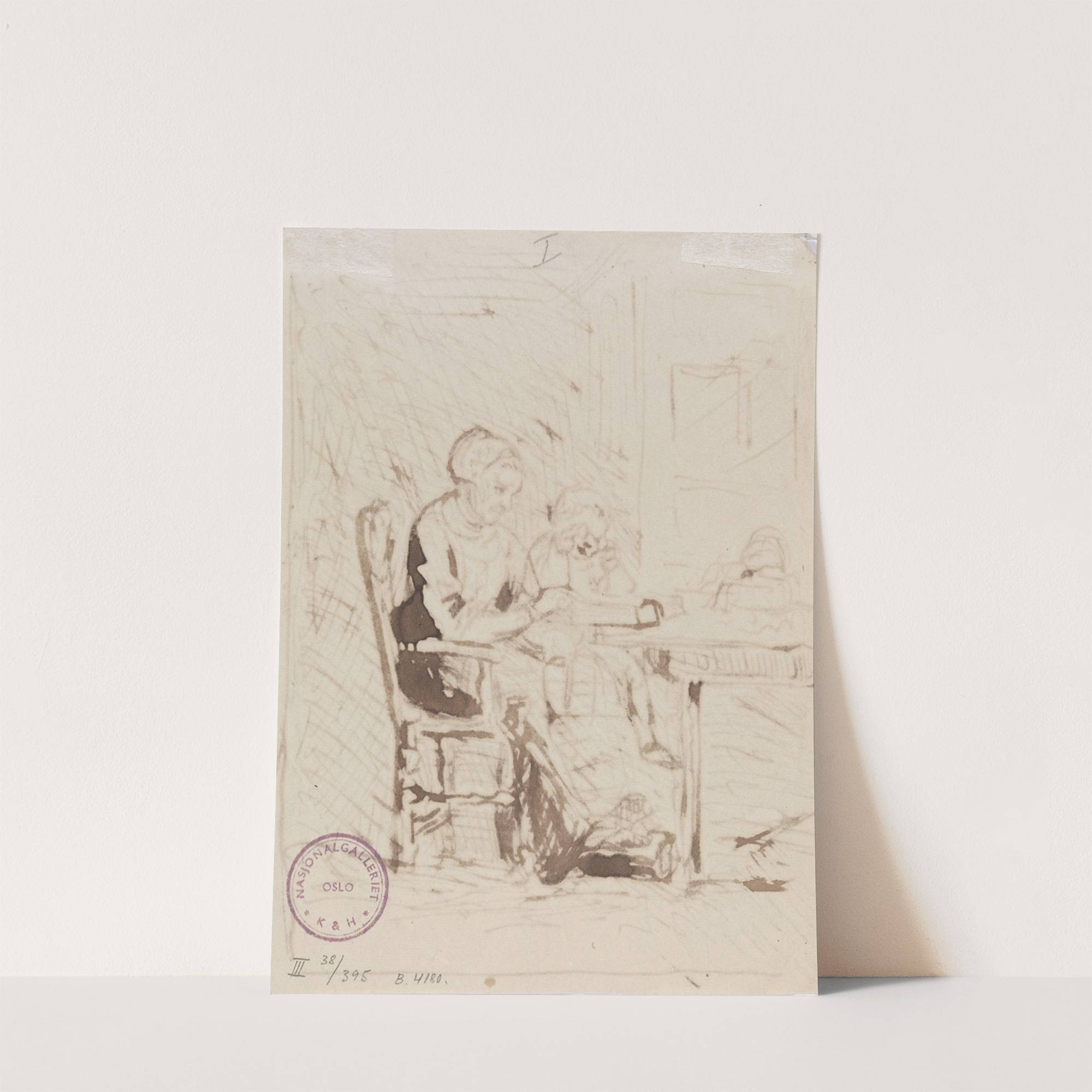 This charming sepia-toned sketch captures a tender moment of intimacy between two individuals seated at a table. The drawing is executed with fine, expressive strokes that create a soft and gentle atmosphere. A woman, with her hair loosely tied back,...