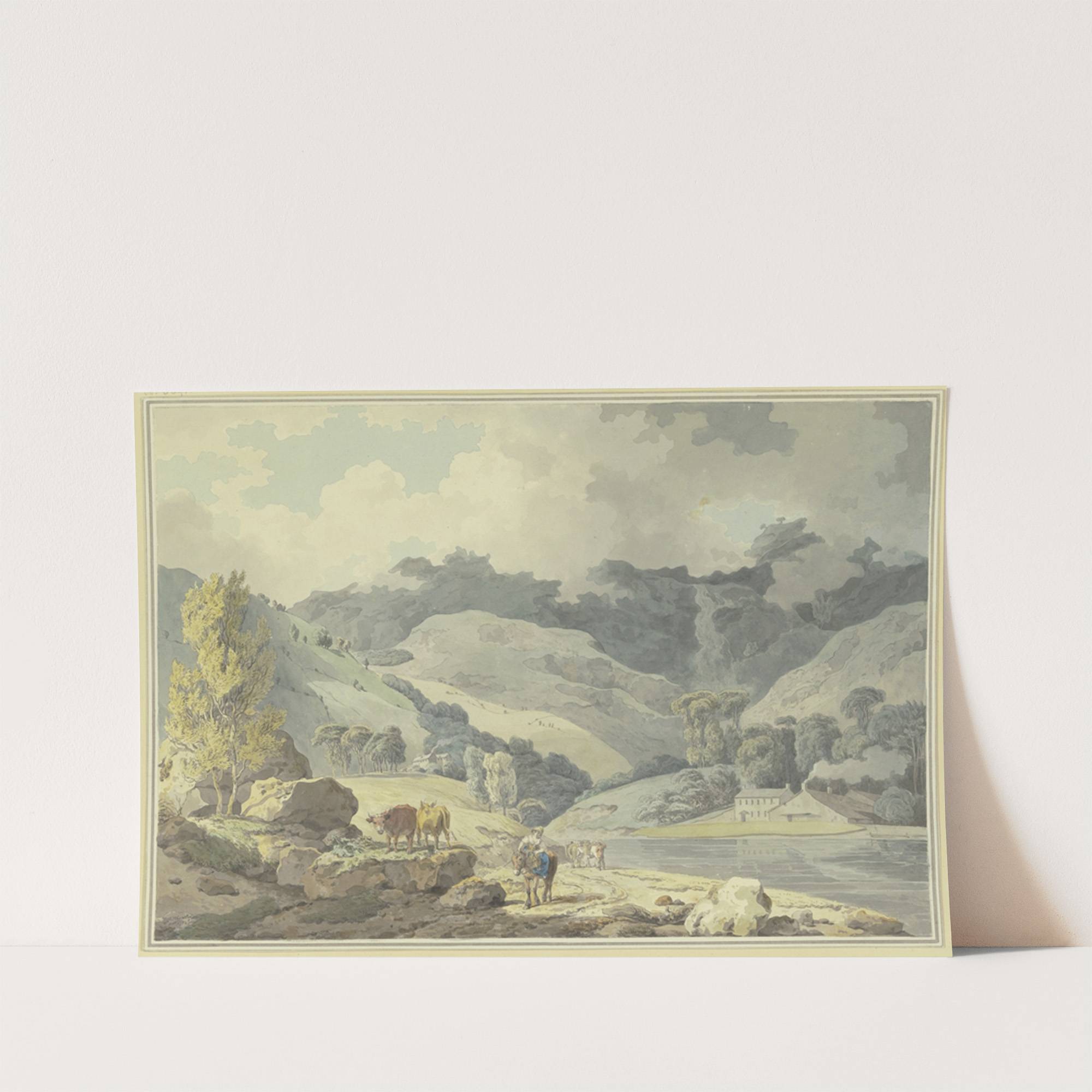 Gebirgslandschaft, auf dem Weg ein Mädchen zu Pferde, links zwei Kühe by Francis Wheatley - Wall Art Print
