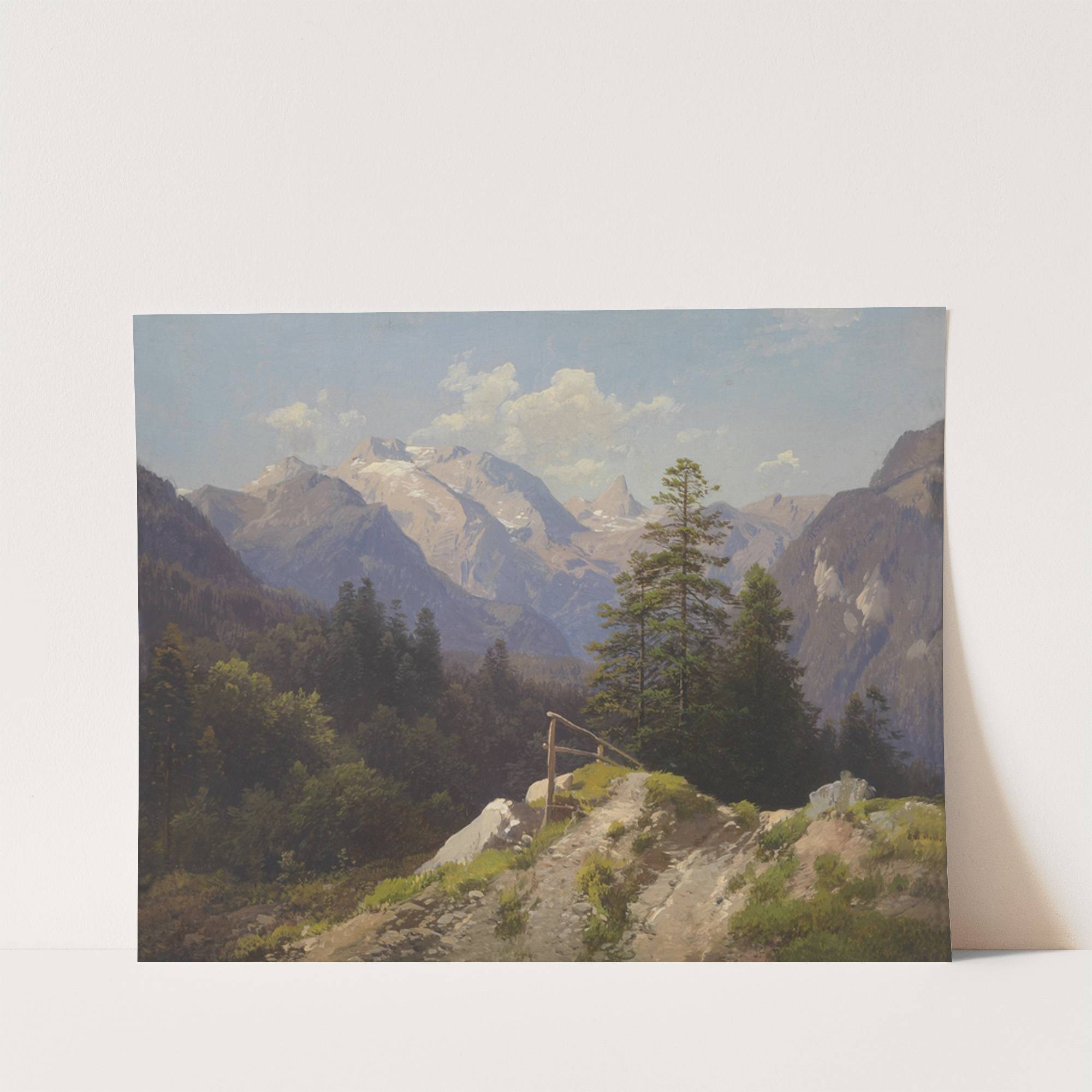 This serene mountain landscape painting by Adalbert Waagen titled "Gebirgsmotiv" captures the tranquility of nature with breathtaking detail. The foreground features a rustic wooden staircase, partially covered in moss and surrounded by rocky terrain and patches of greenery, leading through...