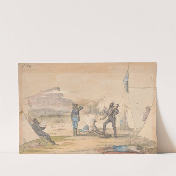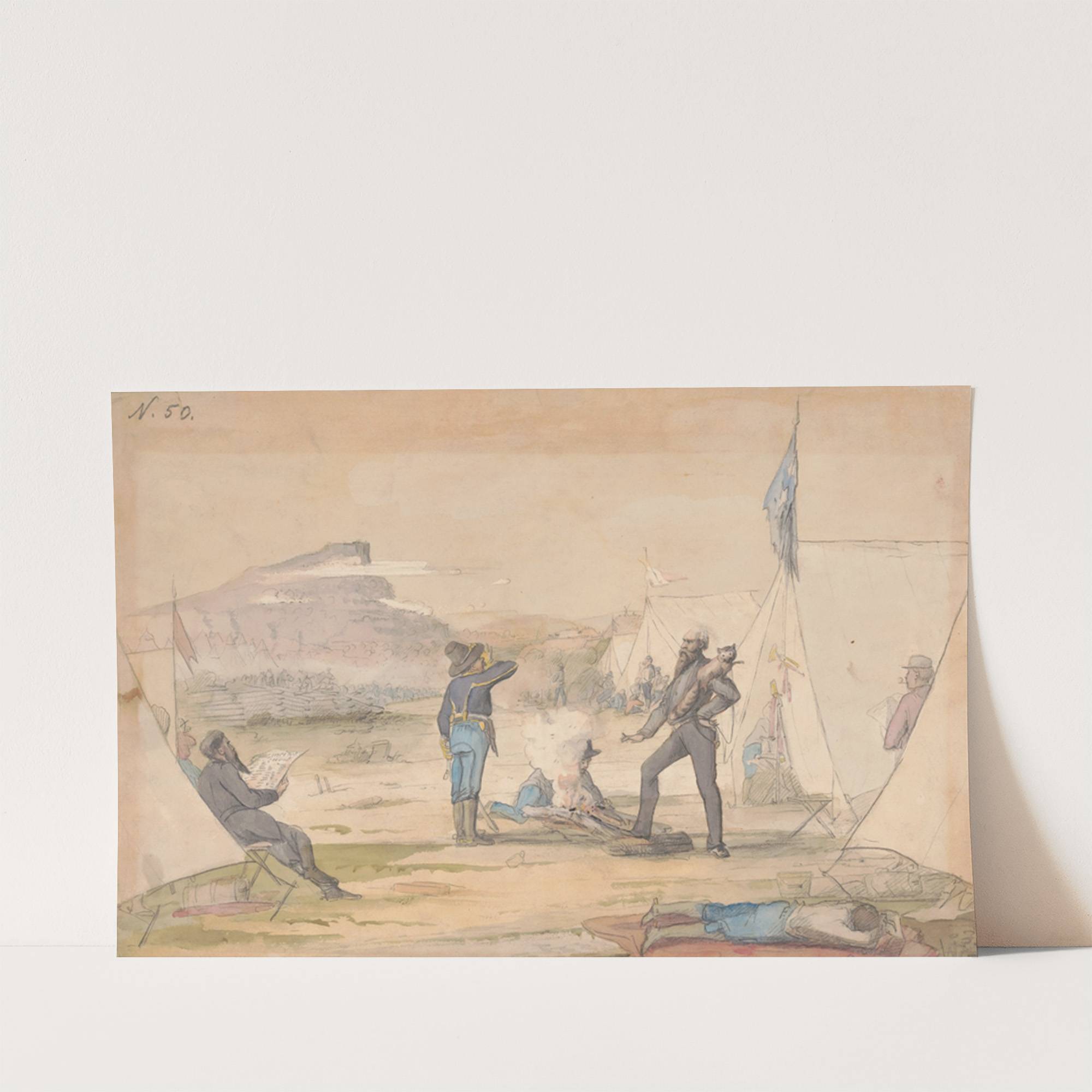 This watercolor painting depicts "General August Willich's quarters near Lookout Mountain, Tennessee" by Adolph Metzner, capturing a historical moment with delicate, light hues. The scene is set outdoors on a sandy, beige expanse, with tents and flags in the background....