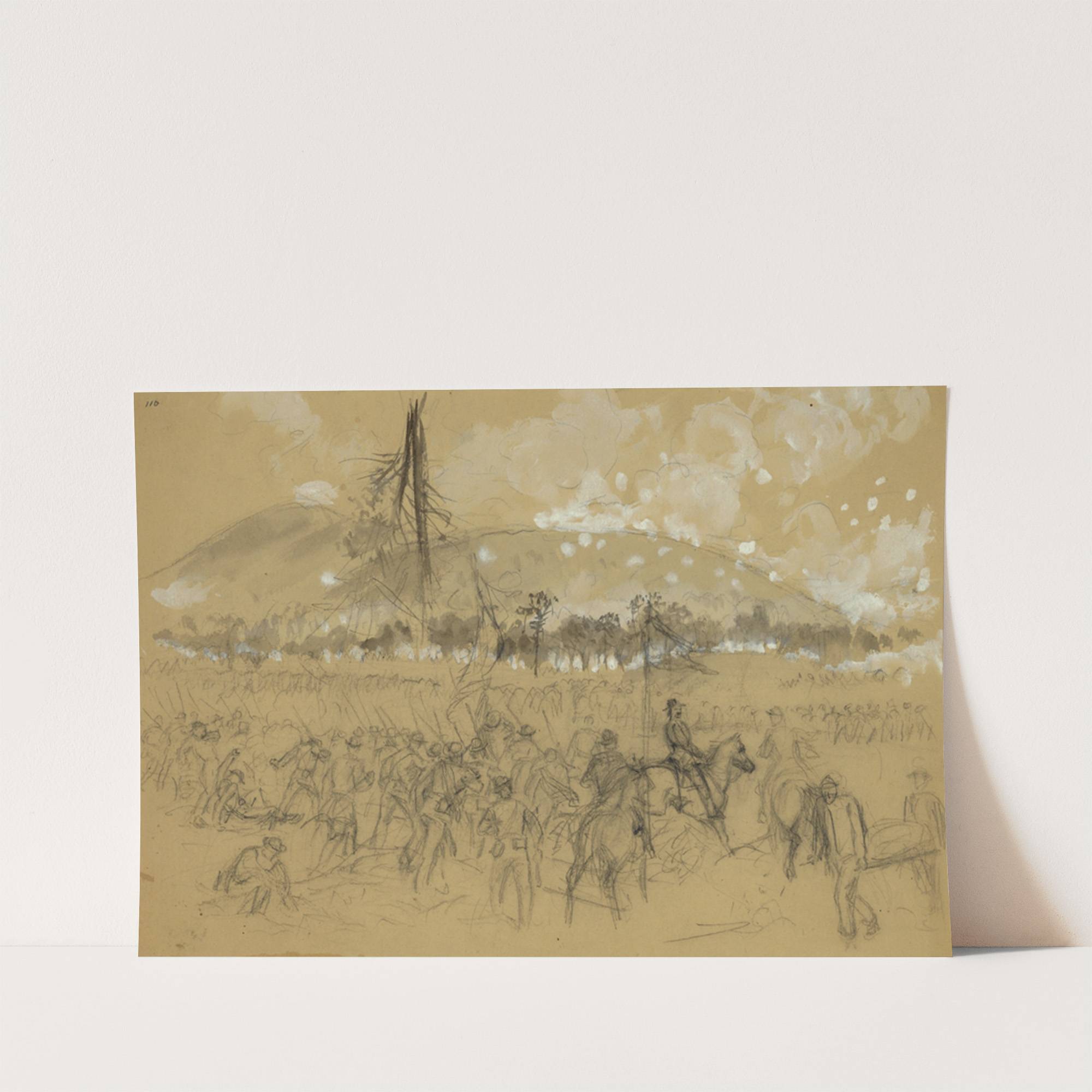 This art print depicts "General Sherman at the Battle of Kennesaw Mountain, Ga." by Alfred Rudolph Waud. The image is rendered in a loose, sketch-like style with fine black pencil lines set against a warm beige background. In the foreground,...