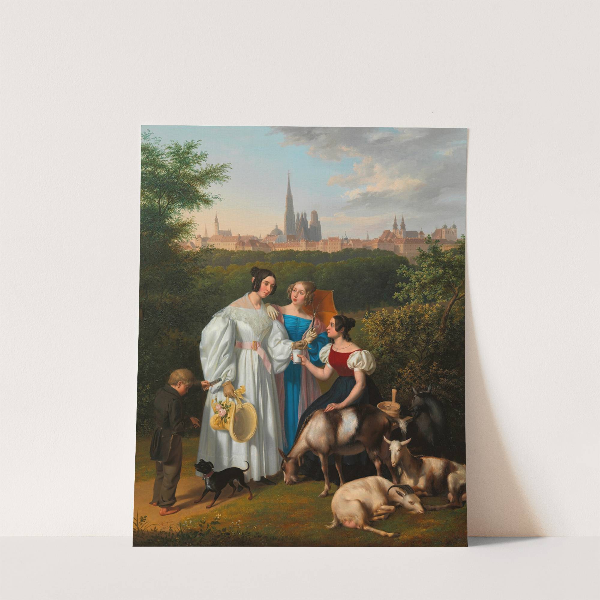 Genreszene auf dem Glacis mit Spaziergängerin, Ziegenhirtin und Lottolosverkäufer mit Wien im Hintergrund (1836) by Josef Ziegler - Wall Art Print